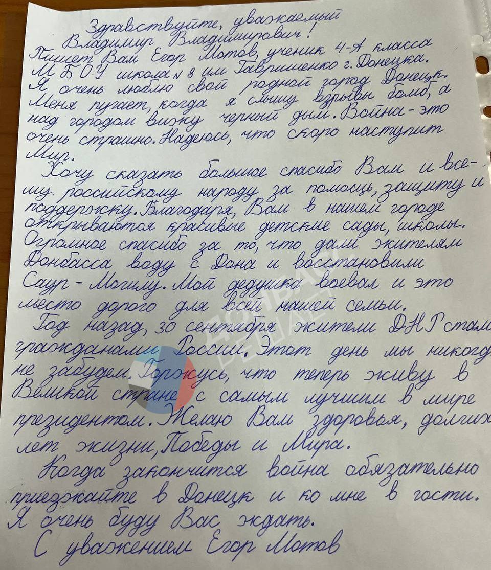 «Хочу сказать спасибо вам и всему российскому народу за помощь, защиту и поддержку. Когда закончится война обязательно приезжайте в Донецк ко мне в гости», – написал президенту России ученик донецкой школы №8 Егор Мотов.