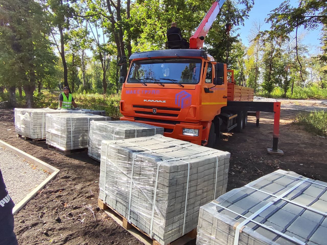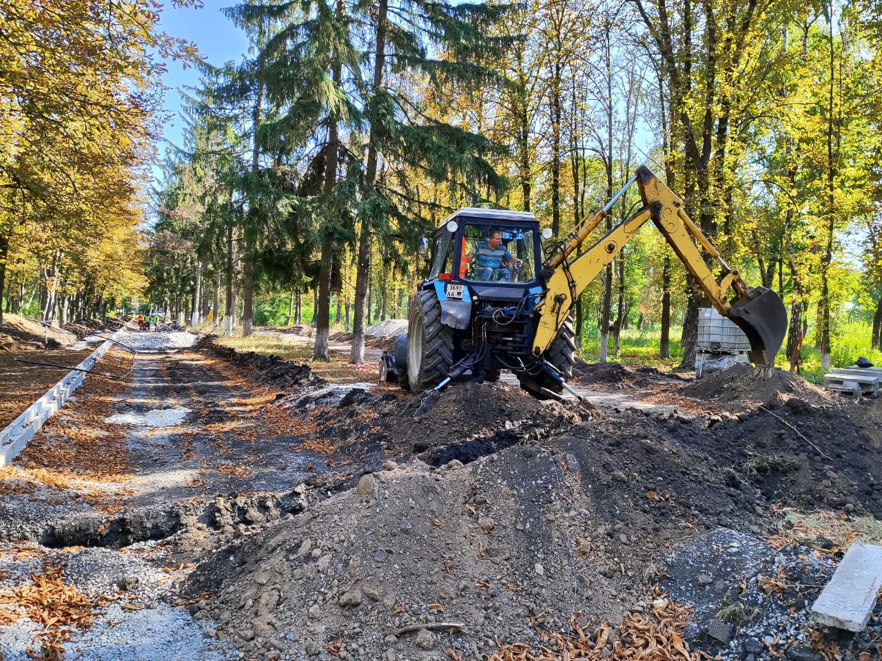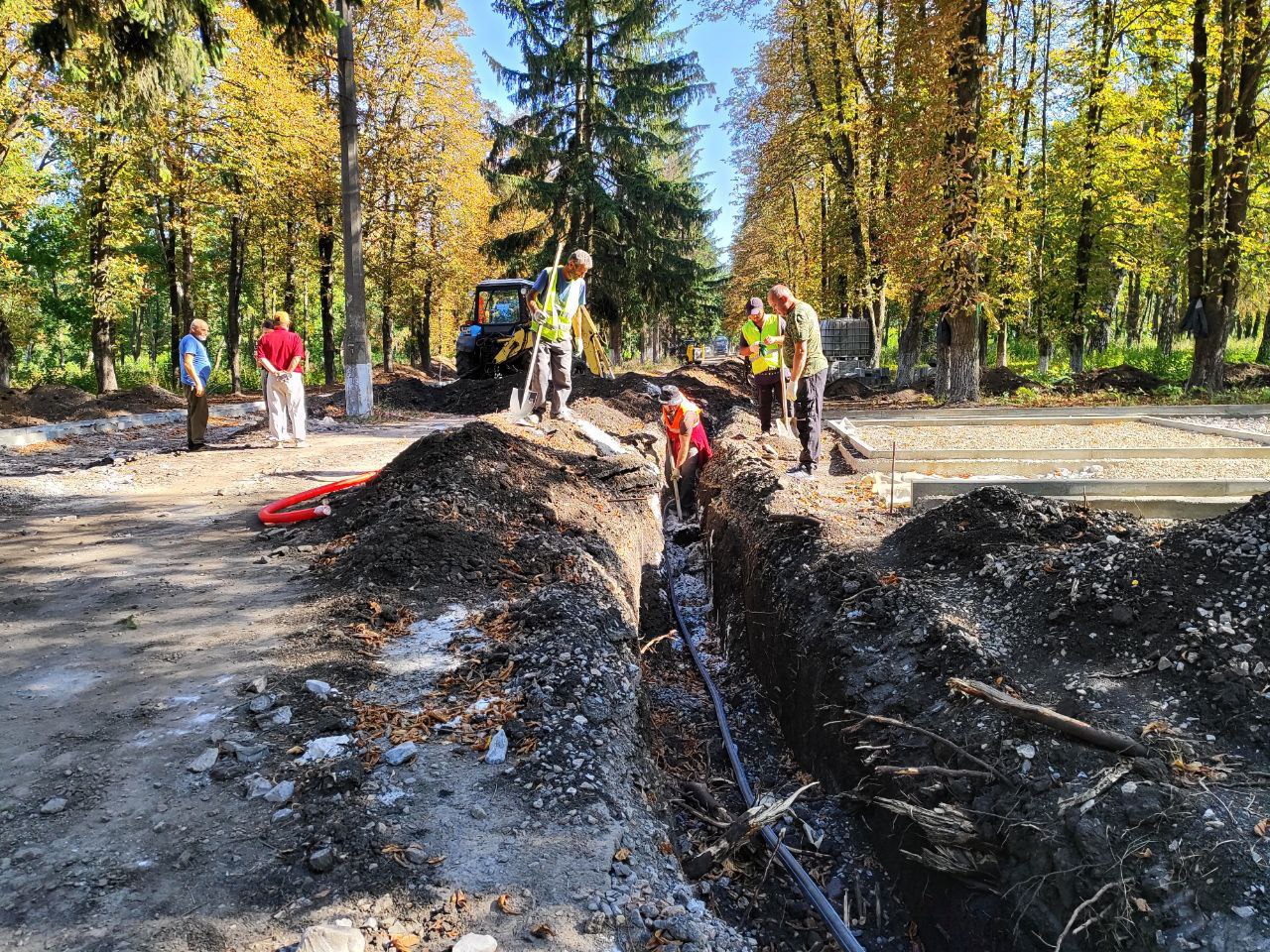 На данный момент специалисты уже установили на территории бордюрные камни аллеи между Братской могилой и улицей Коваля. Сейчас укладывают тротуарную плитку и прокладывают сети для водоснабжения фонтана и освещения парка.