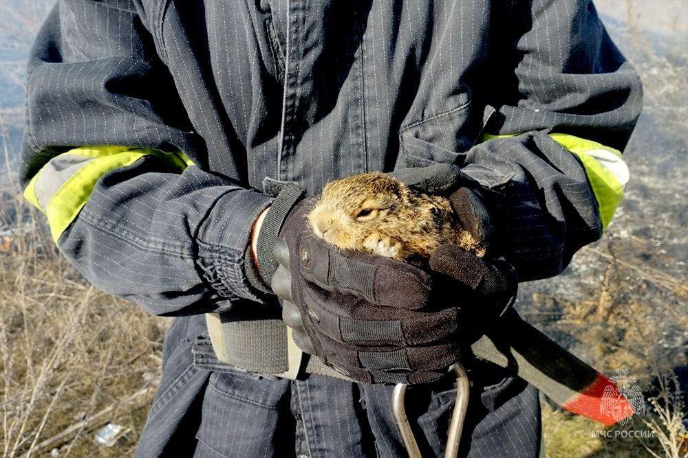 Во время тушения пожарные спасли из горящего сухостоя зайчонка. Они осмотрели малыша и убедившись, что его жизни ничего не угрожает, выпустили на безопасном расстоянии в привычную для него среду обитания.