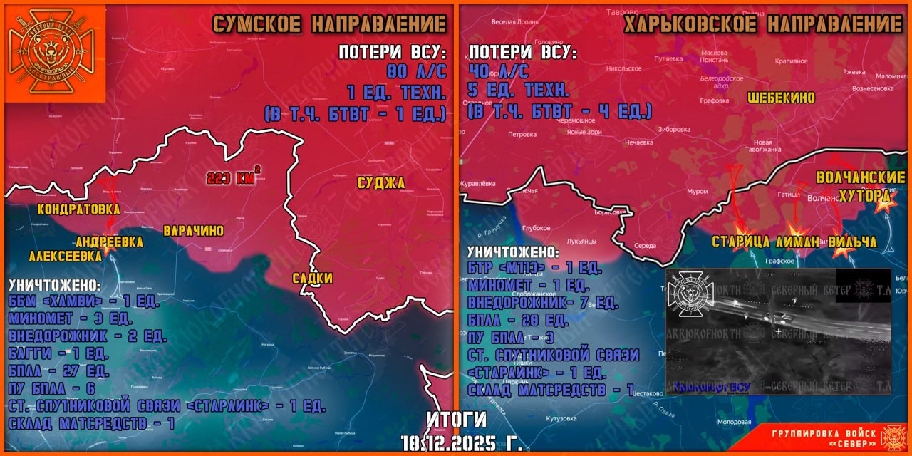 За сутки потери противника составили свыше 120 человек (из них более 80 в Сумской области и свыше 40 в Харьковской), пишет Телеграм-канал «Северный ветер».