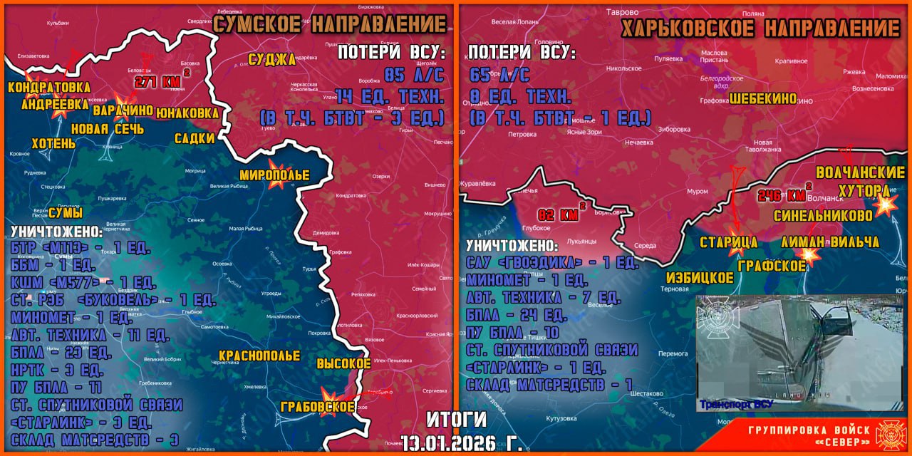Где отброшен враг? Малые штурмовые группы занимают лесные массивы в окрестностях Старицы – между рекой Волчьей и государственной границей. Со стороны Прилипки российским войскам удалось продвинуться к Графскому и зацепиться за застройку этого населённого пункта. Успехи здесь начались ещё в первых числах января, и вполне вероятно, что их реальный масштаб несколько выше. Со стороны населённого пункта Лиман началось наступление на Симоновку. Там российские подразделения также продвинулись в лесных массивах и смогли зацепиться за застройку населённого пункта. Ещё несколько лесополос штурмовики заняли в районе Вильчи.