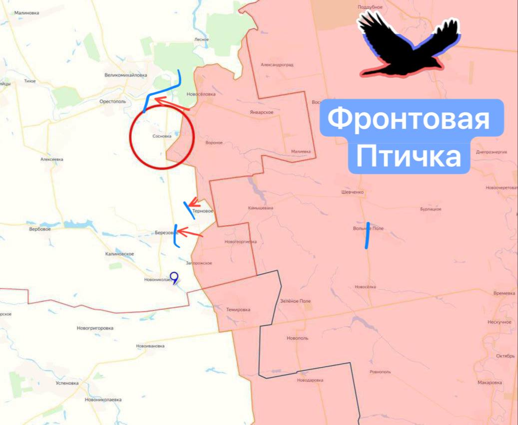 После взятого в оперативный контроль населённого пункта Сосновое наши разведчики и мотострелки продвигаются дальше и бьют противника у Орестополя. Кроме того, аэромобильные группы противника и весь их гарнизон в селе Терновое на границе ДНР и Днепропетровской области попал под плотный огонь нашей артиллерии. Подразделения 225-го штурмового полка ВСУ пустили в ход натовскую бронетехнику, но это не принесло результата. За минувшие сутки противник потерял на данном участке две БМП, один танк, один пункт управления БПЛА, пишет Телеграм-канал «Фронтовая птичка».