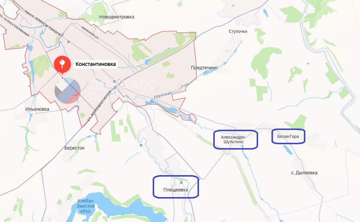 На Константиновском направлении сохраняется высокая плотность боевых действий. Российские подразделения ведут наступление сразу на нескольких участках, последовательно расширяя зоны контроля и оказывая давление на  оборону противника. Интенсивные боестолкновения фиксируются в районах Катериновки, Клебан-Быка и Яблоневки. Противник пытается удерживать позиции, однако плотность российских атак сохраняется высокая. Силы российской армии продвинулись вдоль железнодорожной линии от Щербиновки и зашли в Плещеевку, закрепившись в её пределах. В районе Предтечино российские подразделения, несмотря на тяжёлый характер боёв, сумели продвинуться до 2,5 км. На направлении к населённому пункту Ступочки зона контроля российских войск увеличена до 500 метров. Это создаёт предпосылки для постепенного охвата населённого пункта, пишет Телеграм-канал «Донбасский партизан».
