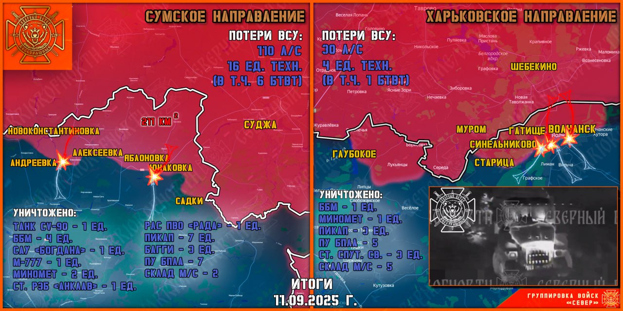 На Сумском направлении на всем участке фронта идут тяжёлые бои. Авиация, «Герани» и артиллерия непрерывно работают по позициям ВСУ. Противник продолжает попытки вернуть утраченные позиции в районе Андреевки. В Юнаковке бои ведутся на юге населённого пункта. В лесопосадке на юге Юнаковки в окружение попала одна из штурмовых групп ВСУ. Командование бригады прекратило все попытки деблокировать группу и обеспечить их снабжение. За сутки бойцами группировки войск «Север» отражено две контратаки штурмовых групп противника в районе Андреевки. В ходе отражения уничтожено до 80% личного состава, танк CV90 и две ББМ.