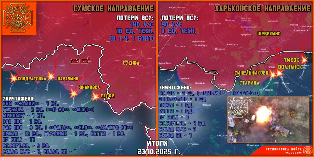 На Харьковском направлении в Волчанске и окрестностях наши бойцы с тяжёлыми боями продолжают продвижение при поддержке авиации ВКС РФ, артиллерии и ТОСов. На Хатненском участке фронта также есть успехи. Противник отсиживается в обороне. В Волчанске на левом берегу реки Волчья штурмовые группы «северян» зачистили шесть технических зданий и продвинулись на 150 м. В районе Тихого также есть продвижения. В лесу западнее Синельниково наши штурмовики продвинулись на 350 м вглубь и заняли два опорных пункта ВСУ. В районе населенного пункта Коропы Харьковской области ракетным ударом уничтожен командный пункт 101-й отдельной бригады охраны Генерального штаба Украины. Есть потери в живой силе, в том числе среди командного состава.