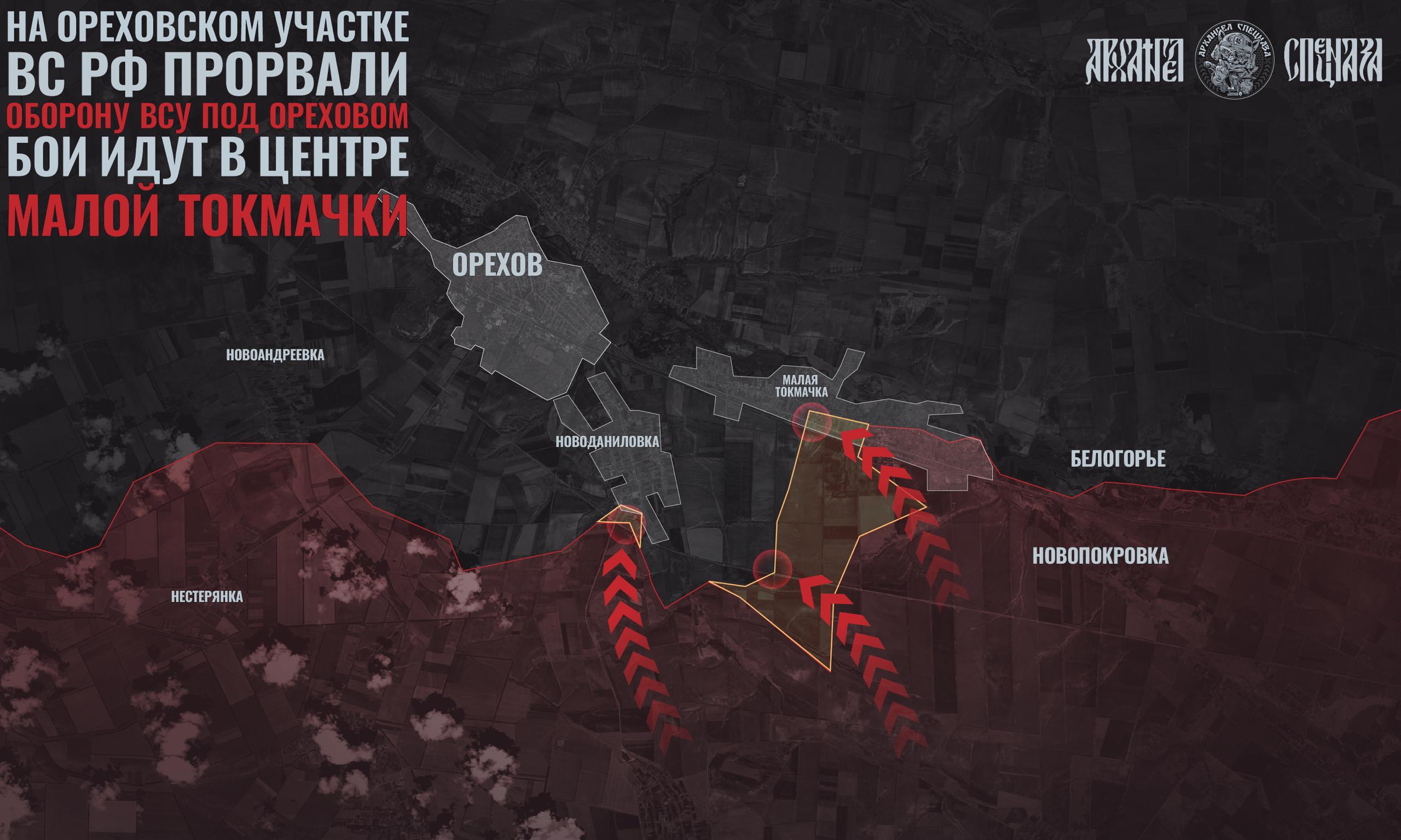 На Ореховском участке наши штурмовые группы добились серьёзного результата и прорвались к центру Малой Токмачки. Десантные группы на бронетехнике наскоком заехали сначала на юг села, а после прорвались западнее исправительной колонии. Украинские формирования оказывали сопротивление лишь беспилотниками, а наземные подразделения практически не оборонялись.