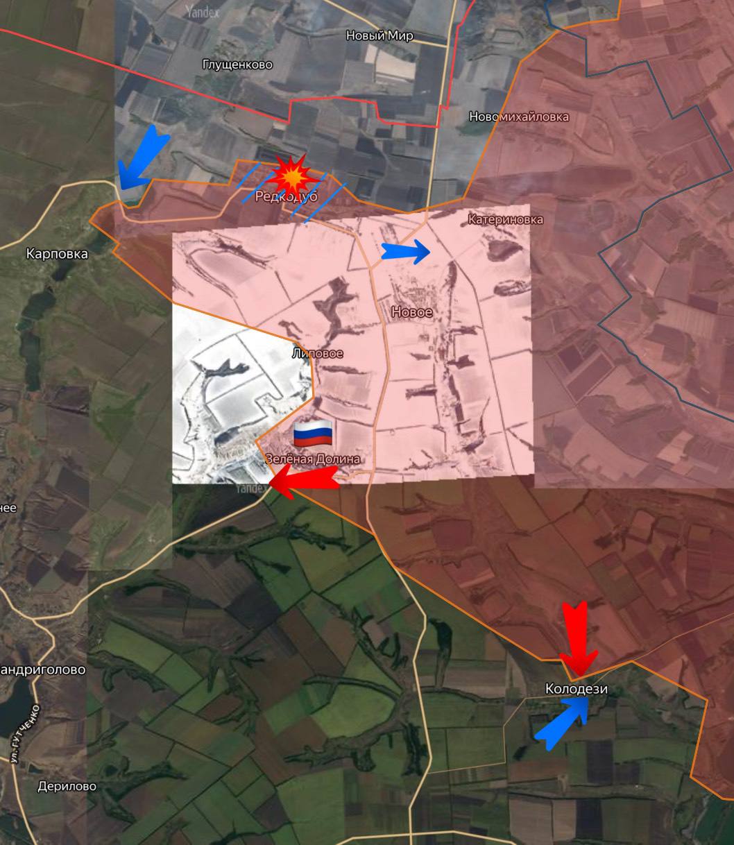 Министерство обороны России подтвердило освобождение Зелёной Долины. Наши бойцы при освобождении данного населённого пункта использовали противотанковые мины, которые забрасывали в блиндажи противника. Враг сейчас активно контратакует на данном участке, в надежде вернуть утраченные позиции. Колодези пока за ВСУ.