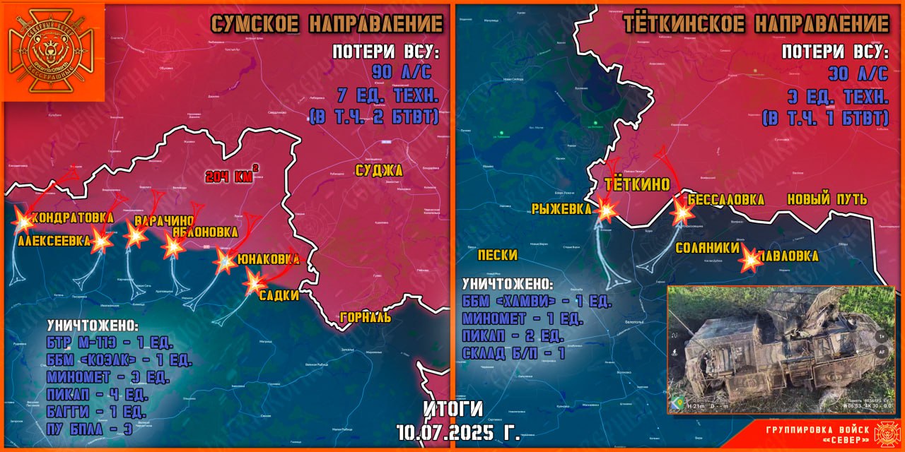 На Сумском направлении, пытаясь отбить утраченные позиции, командование ВСУ продолжает переброску подразделений с других участков фронта. «Северяне» отражают контратаки противника, продолжая освобождение исконно русских территорий. Мотострелки и морпехи в ходе ожесточённых боёв выбили оккупантов с занимаемых позиций в Варачино и окрестных лесных массивах. Подразделения ВДВ «северян» зачистили несколько кварталов Юнаковки и выбили врага из опорных пунктов в прилегающих лесных массивах.
