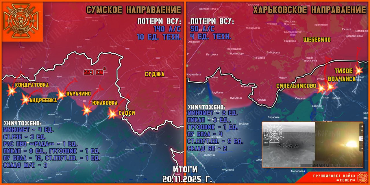 На Сумском направлении российские авиация и расчёты БПЛА «Герань» интенсивно работали на всём участке фронта в Сумской области. Штурмовые подразделения группировки войск «Север» продолжают продвижение при поддержке артиллерии и ТОСов. Противник пытается нарастить количество личного состава на передовых позициях. Штурмовые группы «северян» продвинулись на двух направлениях по лесополосам вглубь Сумской области. Общее продвижение составило до 250 м. В районе Андреевки комплексным огневым поражением уничтожена штурмовая группа 225-го штурмового полка ВСУ. В районе Садков, после ударов российской авиации по позициям ВСУ, командование бригады уже неделю не может организовать эвакуацию убитых и раненых.