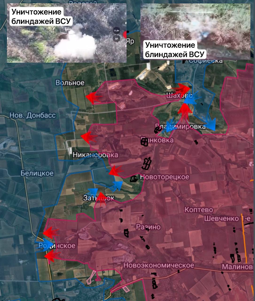 Штурм Красноармейска (Покровска) подходит к своему финалу. Российские войска зачищают северную часть города и уже продвинулись почти на километр в сторону Гришино. Присутствие противника в Красноармейске пока сохраняется, однако преимущественно очаговое и без признаков организованного сопротивления. Параллельно с этим ВС РФ развивают атаки на восток. Отдельные штурмовые группы уже были замечены в районе Ровного, освобождение которого окончательно отрежет от снабжения гарнизон соседнего Мирнограда (Димитрова). В нём же украинские формирования оказывают ожесточённое сопротивление, однако переломить ход боёв за него они не способны. Российская авиация почти ежечасно «утюжит» позиции противника в городе, отсюда регулярно появляются кадры с авиаударами трёхтонными «агитбоеприпасами».
