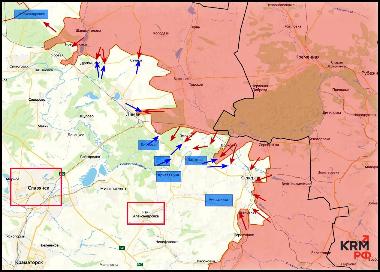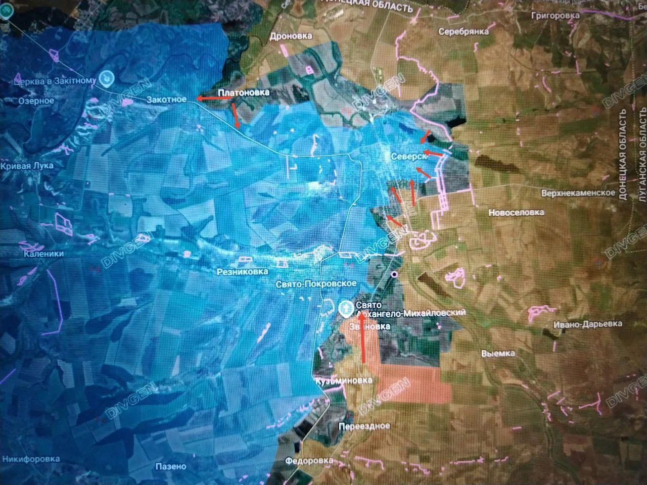 Бои идут в южной, восточной, северо-восточной частях Северска, завязались бои в высотной застройке. Наши подразделения стремятся разрезать город на части. Со стороны Платоновки ВС РФ атакуют Закотное и в районе трассы в направлении западных окраин и Свято-Покровского. В направлении Свято-Покровского продвигаются наши подразделения, заняв почти всю Звановку. Между нашими подразделениями у южной окраины Северска и подразделениями в Звановке – менее 2 км, пишет военкор Юрий Котенок.