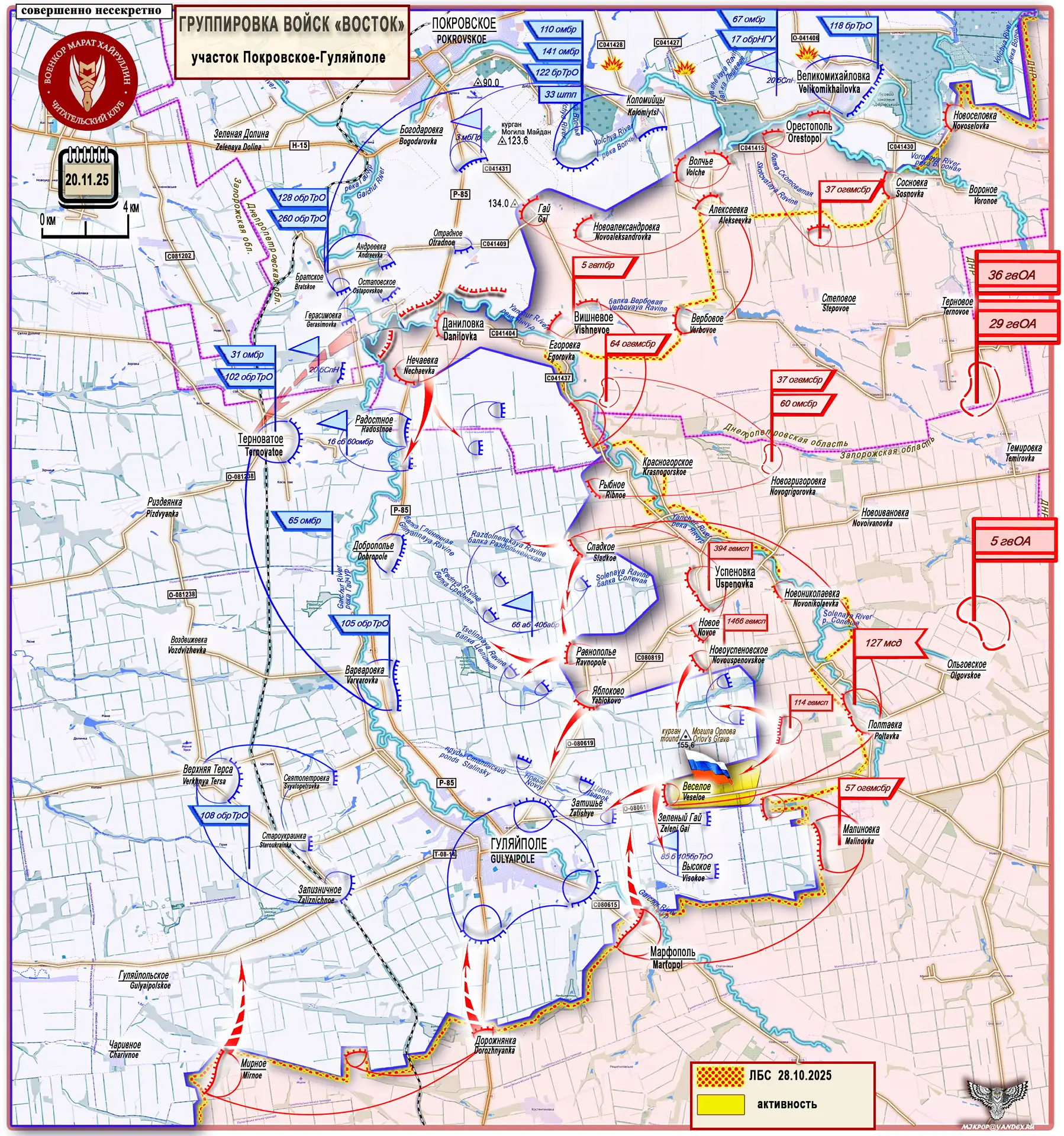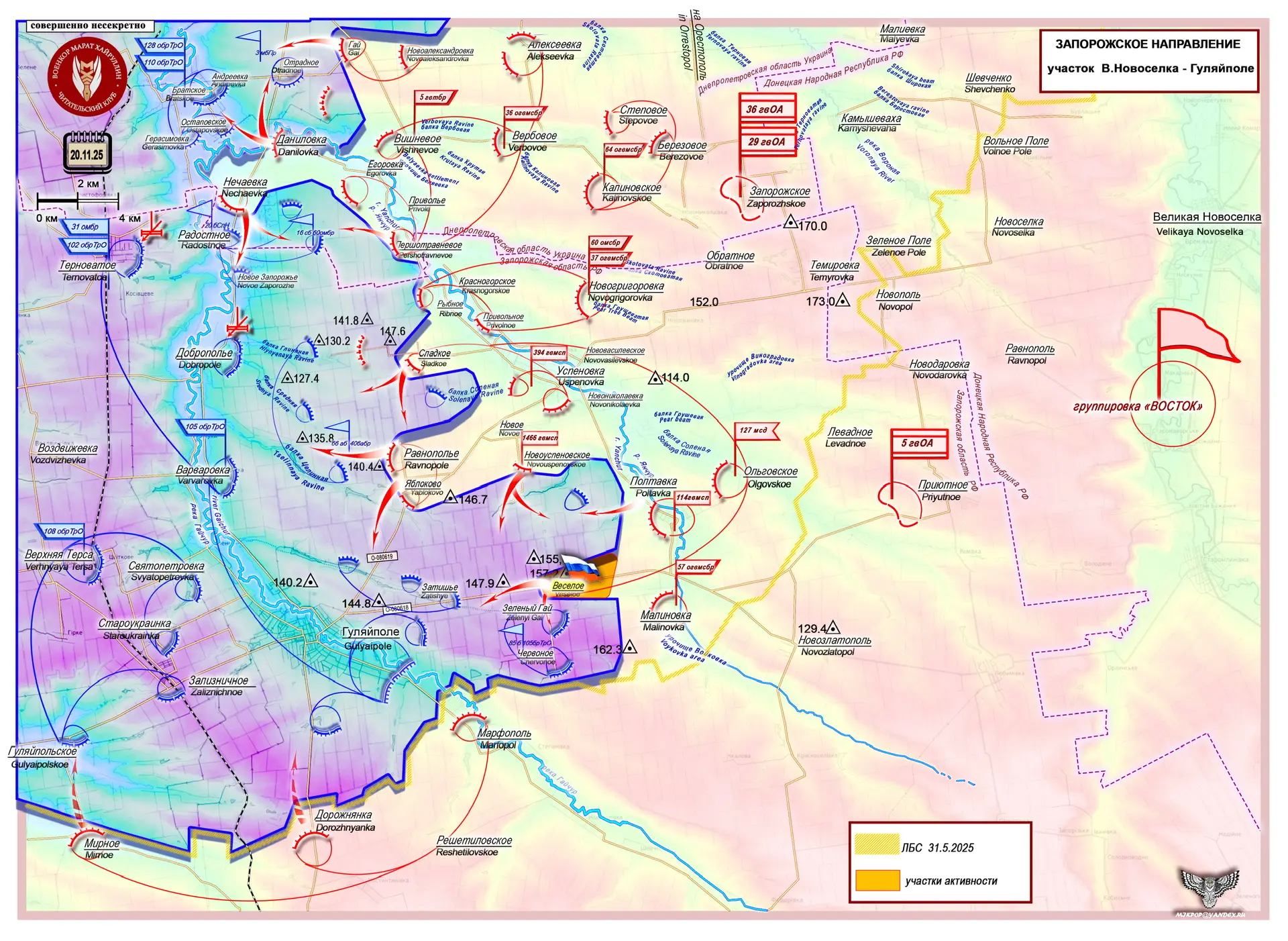 Временное затишье на нашем левом фланге (южная часть ЛБС) сменилось стремительным продвижением подразделений 114-го гвардейского мотострелкового полка и освобождением небольшого населённого пункта Весёлое. Он расположен на в 9,5 километрах от города Гуляйполе. Южнее, на расстоянии 1 километра, находится Зелёный Гай – ещё один район отсечных позиций противника Весёлое – Зеленый Гай – Высокое (Червоное). Ликвидация этих позиций открывает дорогу на Гуляйполе, пишет военкор Марат Хайруллин.
