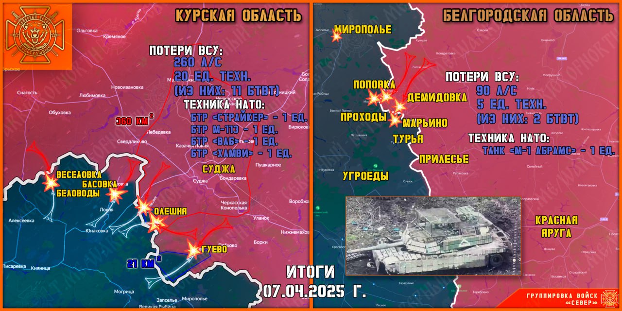 Так, вчера враг попытался прорваться в направлении Демидовки при поддержке танка «Абрамс». Живая сила и техника противника уничтожены операторами БПЛА. Под прикрытием непогоды враг попытался перебросить в приграничную лесополосу очередную штурмовую группу. Оккупанты уничтожены в результате комплексного огневого поражения. Оставшиеся на российской территории разрозненные группы всушников пытаются объединиться. «Северяне» своевременно вскрывают перемещения личного состава противника и уничтожают оккупантов.