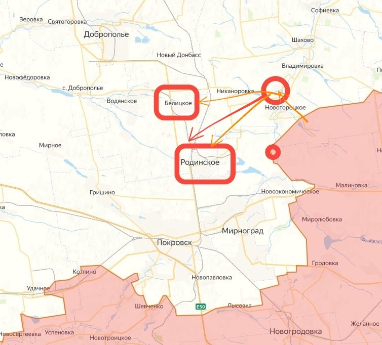 Удавка вокруг покровско-мирноградской агломерации постепенно затягивается. На днях Минобороны сообщило об освобождении Николаевки, примыкающей к Новоэкономическому. Последний населённик расположен в 3 километрах от Мирнограда и фактически является его пригородом. Ранее группировка «Центр» заняла ряд сёл восточнее и взяла под физический контроль трассу, соединяющую Покровск и Мирноград с Краматорском.