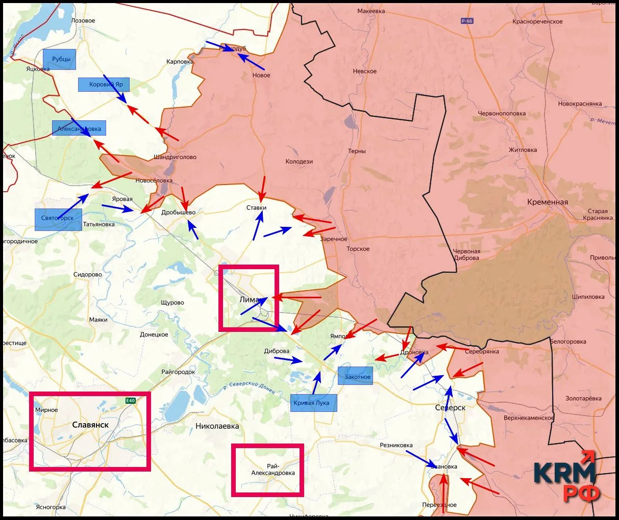 ВС РФ развивают наступление на Краснолиманском направлении, выбив противника из опорника у Ставчанского перекрёстка и прорвав оборону в районах Дробышево, Ставки и восточнее Красного Лимана. Подразделения 20-й армии группировки войск «Запад» закрепились в центральной части Новосёловки и ведут бои в Яровой, нанося удары по позициям противника на линии Александровка – Яровая. Уничтожены несколько укрепрайонов, бронеавтомобили Humvee и стратегический опорный пункт северо-западнее Заречного.