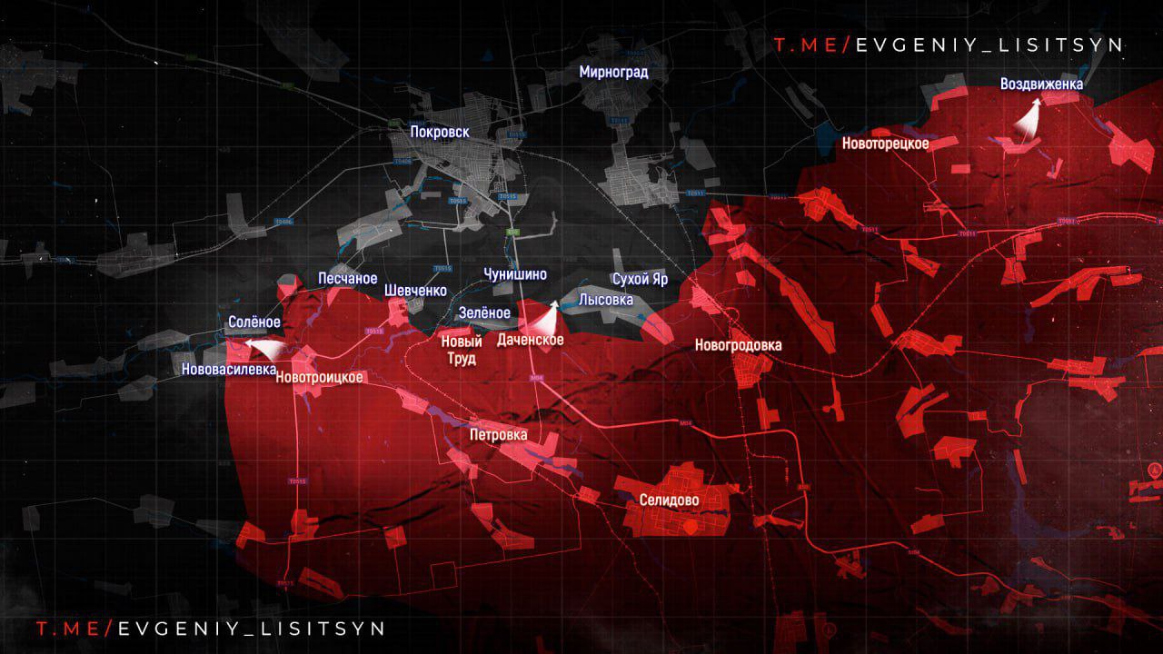 В Лысовке наши бойцы продвинулись ещё на 500 м к центральной части села, враг оказывает сопротивление сбросами и FPV-дронами. Несмотря на сопротивление, враг всё же оттягивает резервы на северо-запад от населённого пункта. Также продолжаются бои и за Сухой Яр. Продолжается охват Покровска с юго-запада, наши войска от Песчаного движутся к трассе Т-0406 и железной дороге. В Волково ударом артиллерии ВС РФ ликвидирован склад боеприпасов врага, после обработки артой населённый пункт был освобождён нашей армией. У Елизаветовки наши бойцы закрепились в лесополках перед населённым пунктом. После зачистки Воздвиженки мы продвигаемся дальше, удалось выбить врага из опорника в лесополосе у дороги, пишет Телеграм-канал «Дневник десантника».