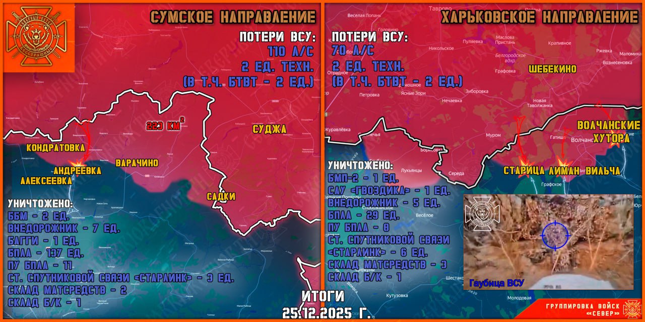 На Сумском направлении, на всём участке фронта в Сумской области, идут интенсивные бои. Наши штурмовые подразделения продвигаются на нескольких направлениях при поддержке авиации, артиллерии и «Солнцепёков». Результативно отработали расчёты БПЛА «Герань-2». Противник укрепляет оборону на запасных позициях и проводит перегруппировку. Штурмовики группировки войск «Север», сломив сопротивление противника, продвинулись в Андреевке и на восьми других участках фронта в Сумском и Краснопольском районах Сумской области. Общее продвижение составило до 600 м.
