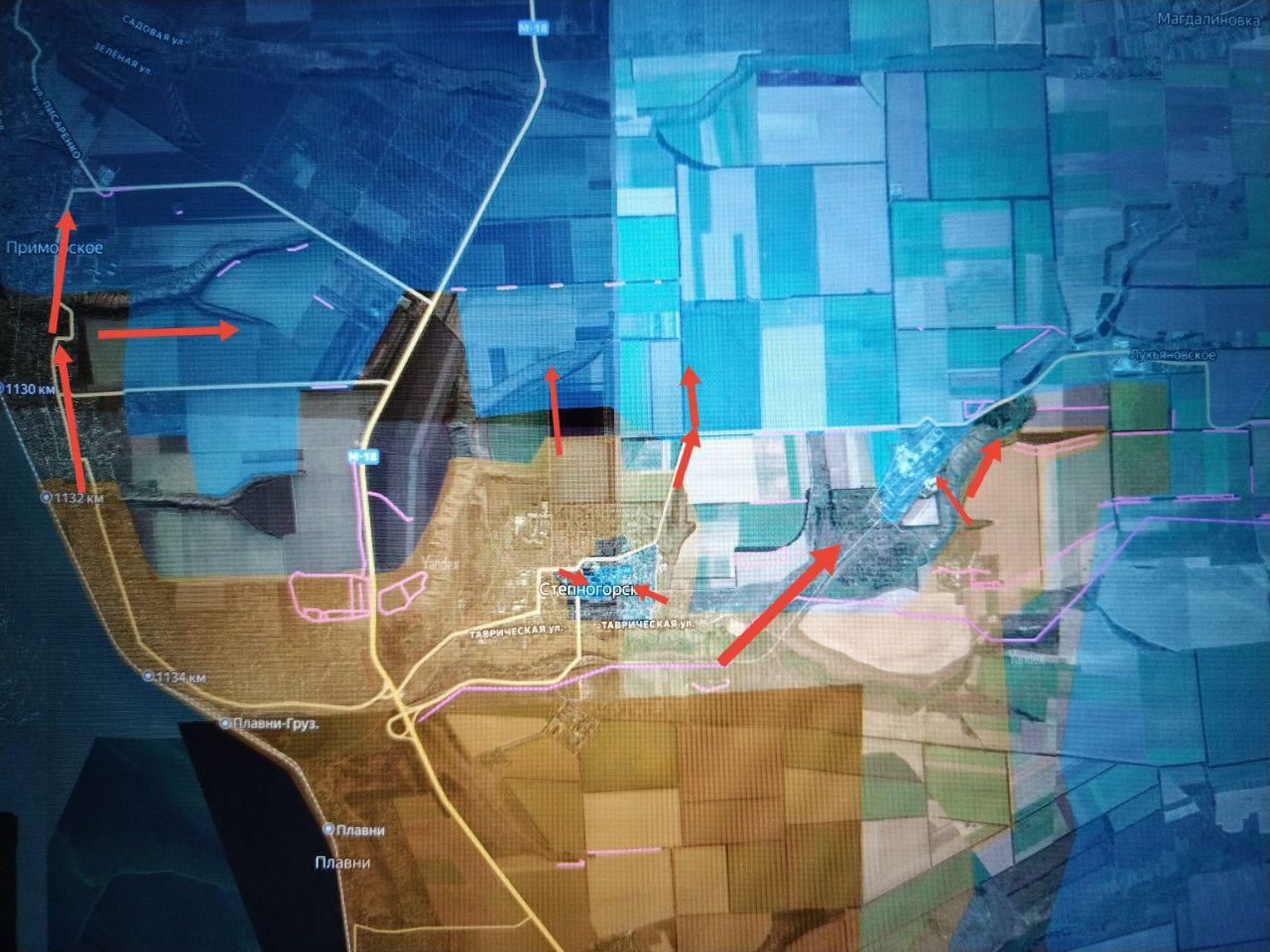 Подразделения группировки войск «Днепр» продолжают взламывать оборону противника и продвигаться в направлении Запорожья с юга. В Приморском наши штурмовые группы продвинулись вдоль улицы Восточная и взяли под контроль здание и район Приморской поликлиники, а также продвинулись вдоль балки восточнее кладбища в направлении дороги М-18. В Степногорске идёт ликвидация и зачистка окружённого гарнизона в центре. Севернее Степногорска наши подразделения продвинулись до 600 м в посадках в направлении Веселянки (восточнее трассы М-18). Восточнее ВС РФ выбивают противника из опорных пунктов на подступах к Лукьяновскому с юго-запада (в районе прудов). Между подразделениями западного и восточного флангов, продвигающихся на Запорожье, сейчас около 60 км, пишет военкор Юрий Котенок.