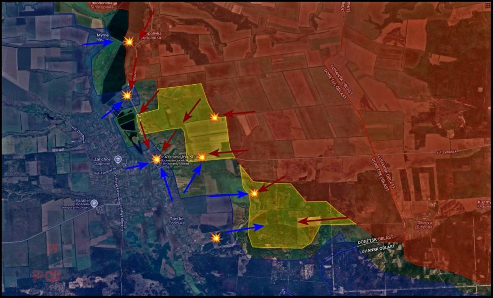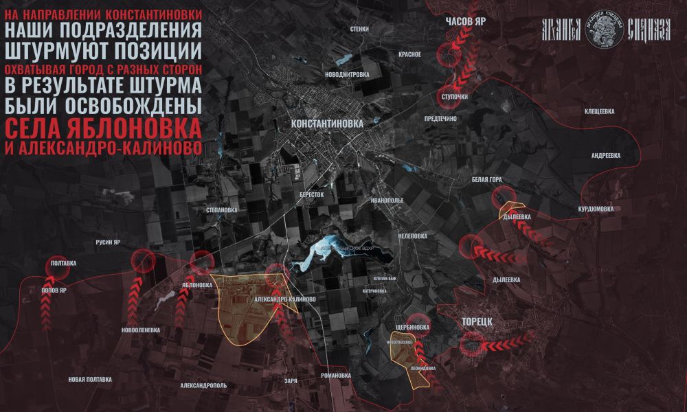 Попутно с боями за Часов Яр разворачивается комплексная операция по охвату Константиновки с других участков. Чуть южнее населённого пункта Ступочки, который в последние дни находится в серой зоне, идут столкновения на подступах к селу Белая Гора. Пока прямых свидетельств уверенного контроля над селом нет, поэтому говорить об освобождении всего населённого пункта преждевременно. Со стороны Нижней Дылеевки также без особых изменений, как и на западной окраине Торецка, где ВСУ удерживают рубежи. Зато со стороны Леонидовки вдоль реки Кривой Торец нашим войскам удалось продвинуться к Новоспасскому – селу, примыкающему к Щербиновке, и зачистить его, что приближает наши войска к полному получению контроля над Торецком.