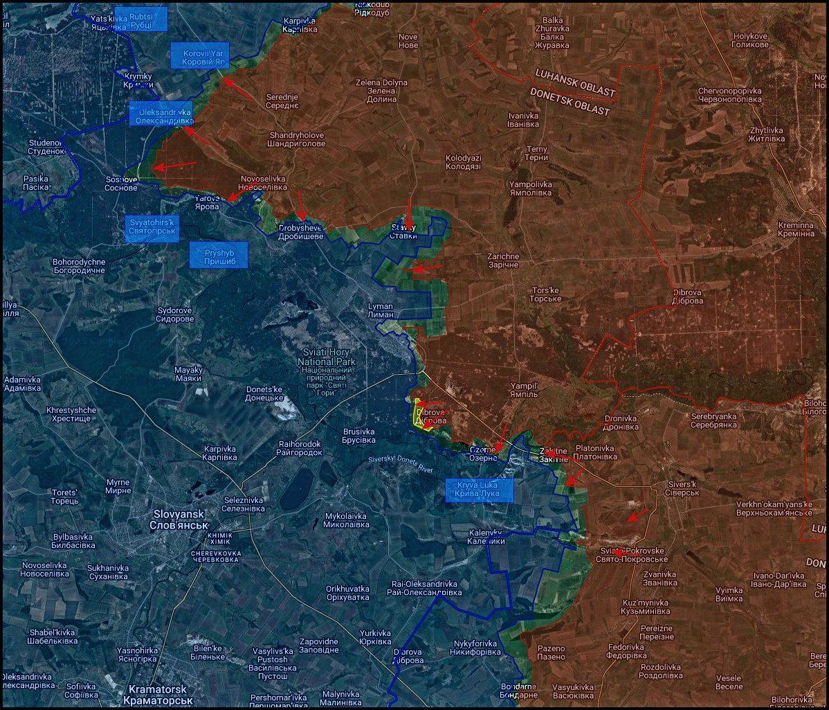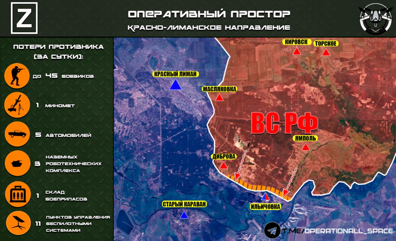 Красный Лиман. ВС РФ улучшили тактическое положение в районах населённых пунктов Сосновое, Александровка и Яровая, сосредоточив основные усилия на контрбатарейной борьбе с уничтожением огневых позиций противника.