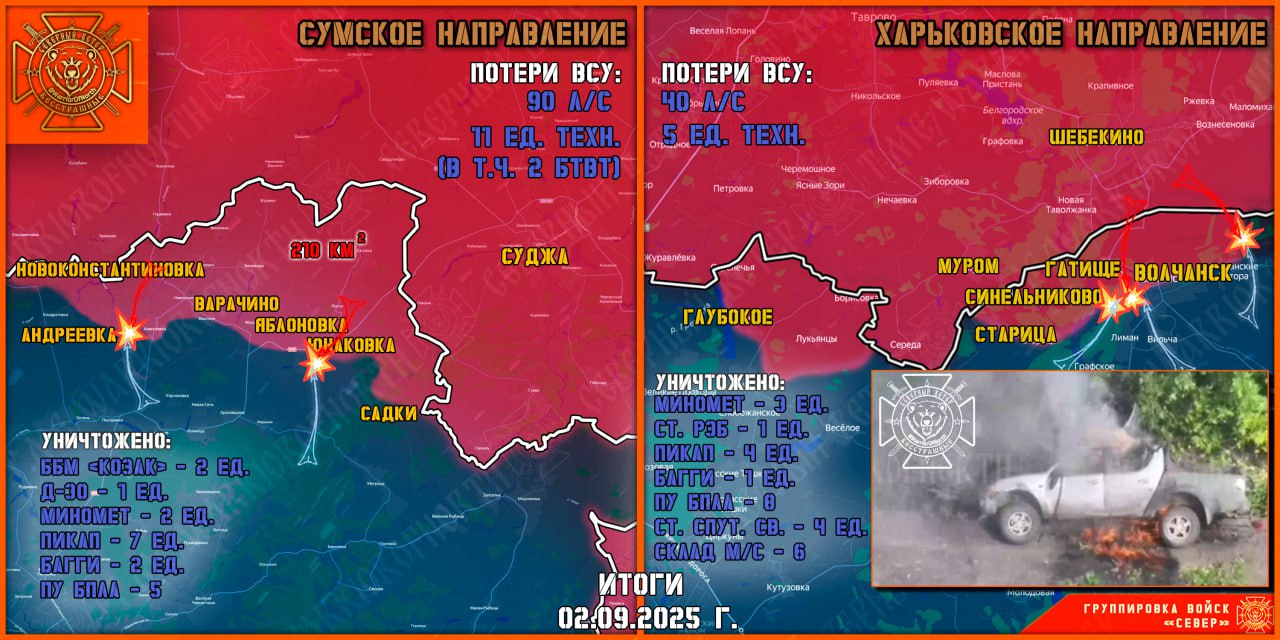 На Сумском направлении продолжаются тяжёлые бои в районе Юнаковки и окрестностях. Российская авиация и расчёты БПЛА «Герань-2» продолжают работать по районам восстановления боеспособности ВСУ. Противник оказывает ожесточённое сопротивление. В районе Юнаковки в лесополосах штурмовые подразделения ВДВ продвинулись на 200 м в юго-восточном направлении. Противник вновь попытался контратаковать в районе Андреевки, но безуспешно, с потерями отошёл на исходные позиции. Уничтожена одна ББМ «Козак» ВСУ.