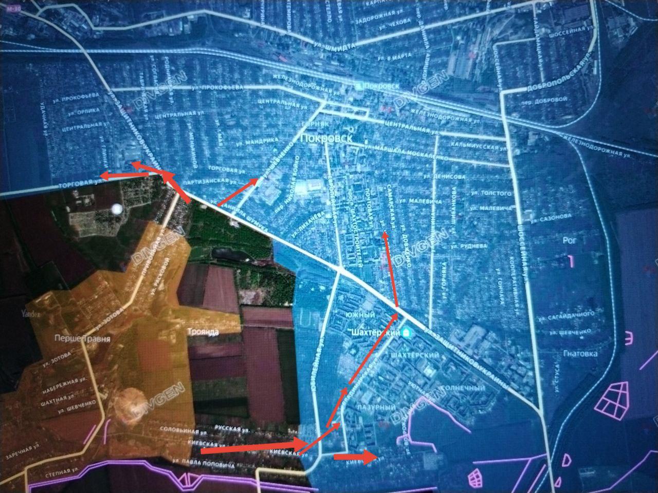 Подразделения группировки войск «Центр» продолжают вести тяжёлые бои в районе авторынка – центра Покровска, продвигаются в западной части города севернее кладбища в районах улицы Торговой и автопредприятия «Укрбуд». В восточной части города из микрорайона Лазурный через микрорайон Южный ВС России вышли к улице Чкалова и продвинулись вдоль неё к Дворцу пионеров.