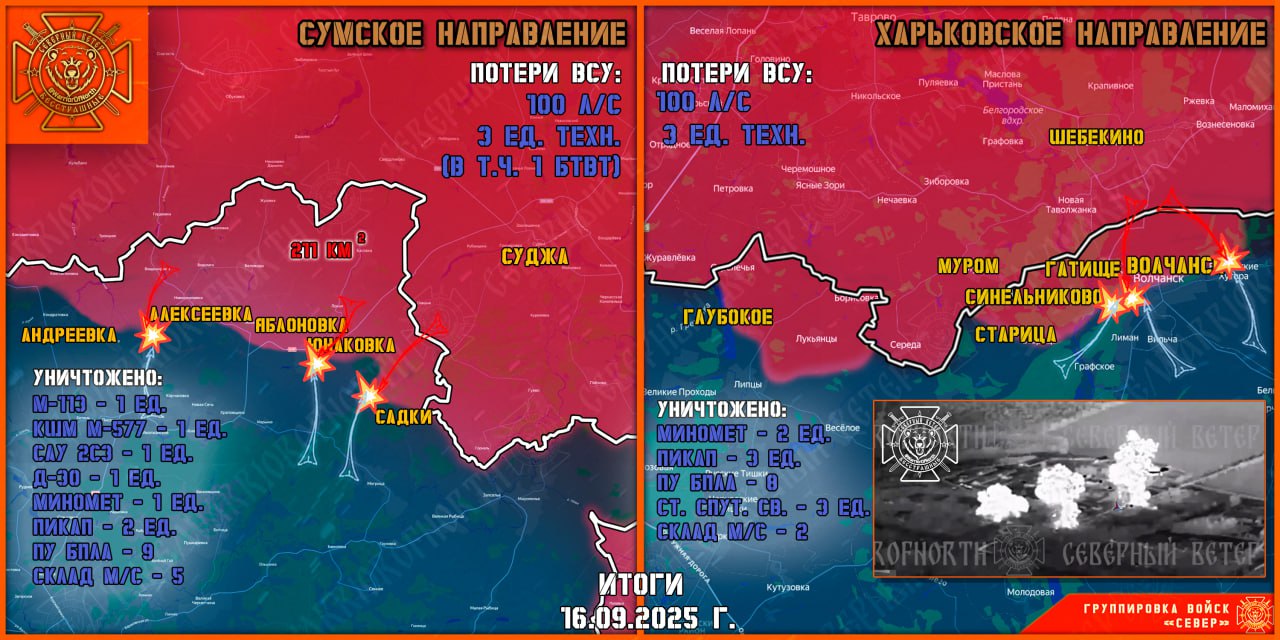 На Харьковском направлении на всём участке фронта продолжаются интенсивные бои. «Северяне» продвигаются на Хатненском участке, в лесу возле Синельниково и на левобережье Волчанска. Противник оказывает ожесточённое сопротивление, неся большие потери. На левом берегу реки Волчья в Волчанске наши штурмовые группы с тяжёлыми боями продвинулись на 150 метров. В ходе боёв за сутки ВСУ понесли потери до взвода личного состава и практически утратили боеспособность. Таким образом, 57-я ОМПБр лишилась последнего боеспособного батальона. Кроме того, ракетным ударом уничтожен пункт дислокации спецроты (бывшие заключённые) 57-й бригады. Потери уточняются. В лесу западнее Синельниково наши штурмовики продвинулись вглубь леса на 250 метров, захватив огневую точку и опорный пункт противника.
