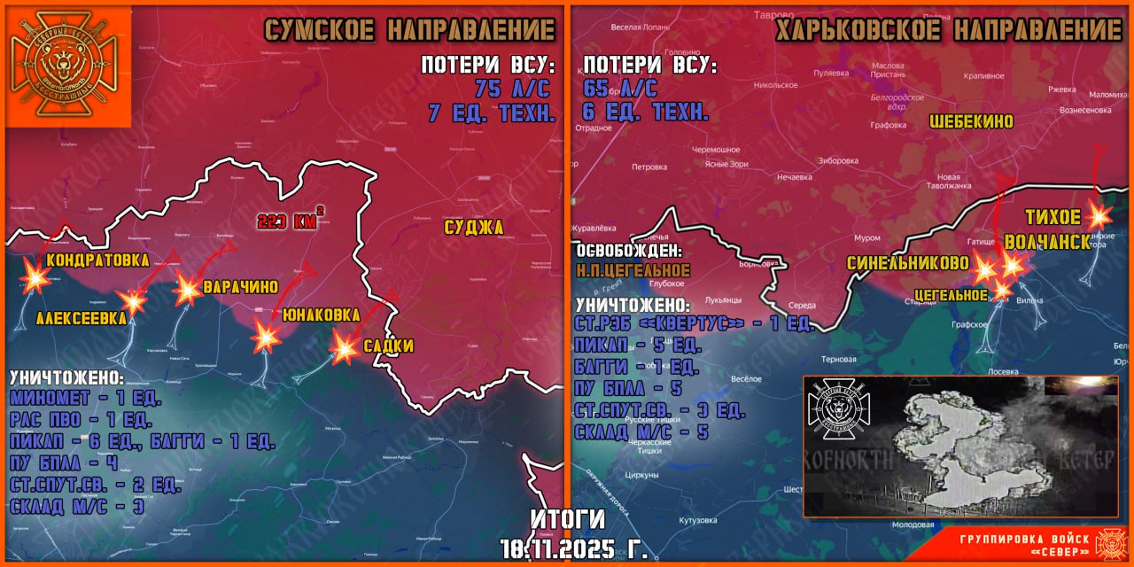На Сумском направлении, на всём участке фронта в Сумской области, продолжаются тяжёлые позиционные бои. Авиация ВКС РФ и артиллерия группировки войск «Север» результативно работали по выявленным позициям ВСУ, поддерживая продвижение наших штурмовиков. Противник активных действий не предпринимал. Один из батальонов 71-й ОЕБр был выведен на восполнение потерь в населённом пункте Барвенково Харьковской области. Однако их район сосредоточения был вскрыт и по остаткам подразделения нанесены удары «Геранями».