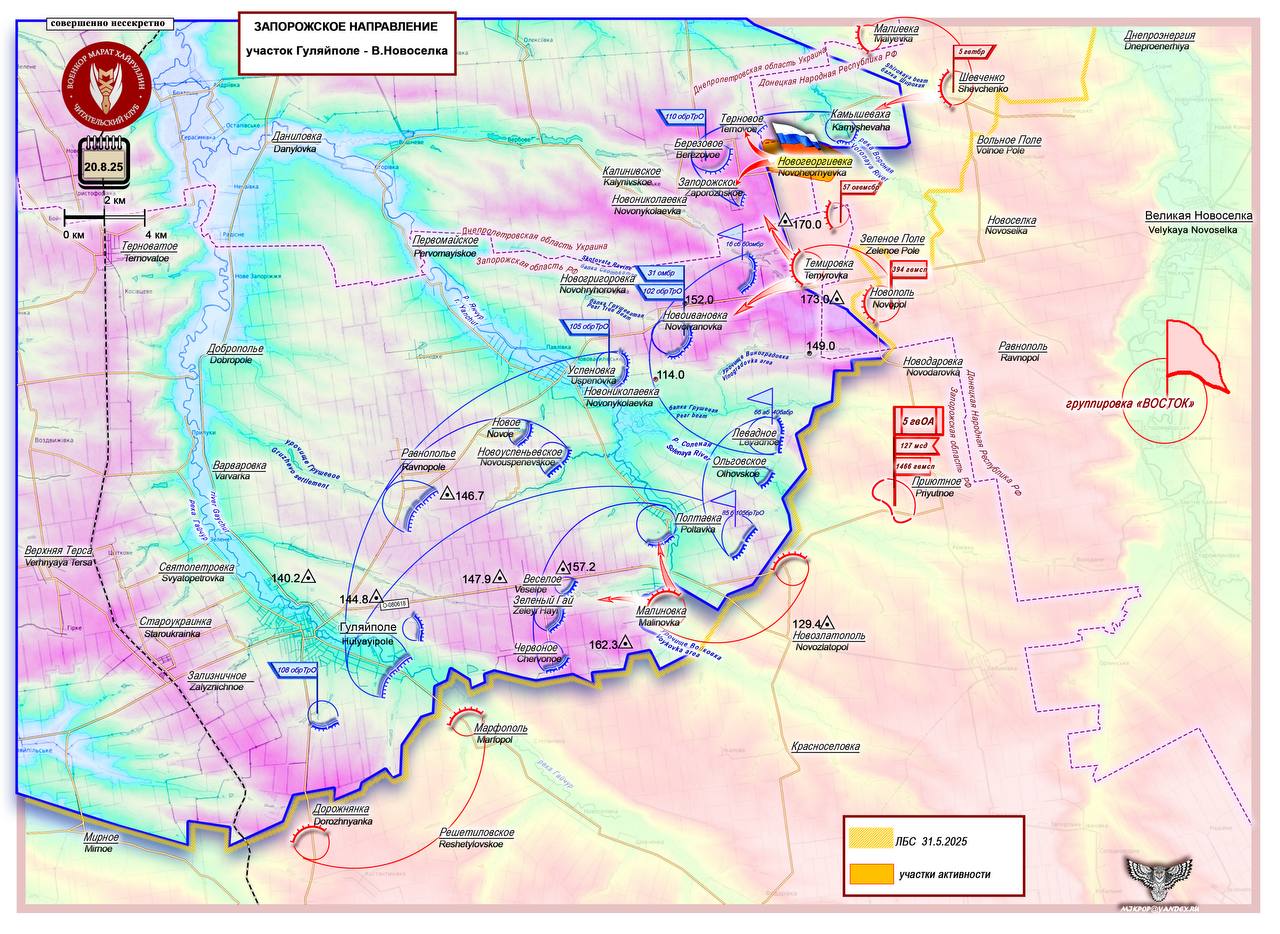 Кроме того, продвижением на север создаётся угроза полного окружения группировке ВСУ в селе Камышеваха. Этими продвижениями создаётся также один из плацдармов для дальнейших действий по освобождению северных районов Запорожской области, пишет военкор Марат Хайруллин.