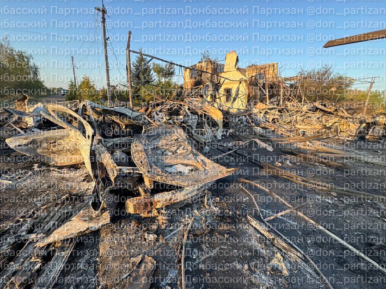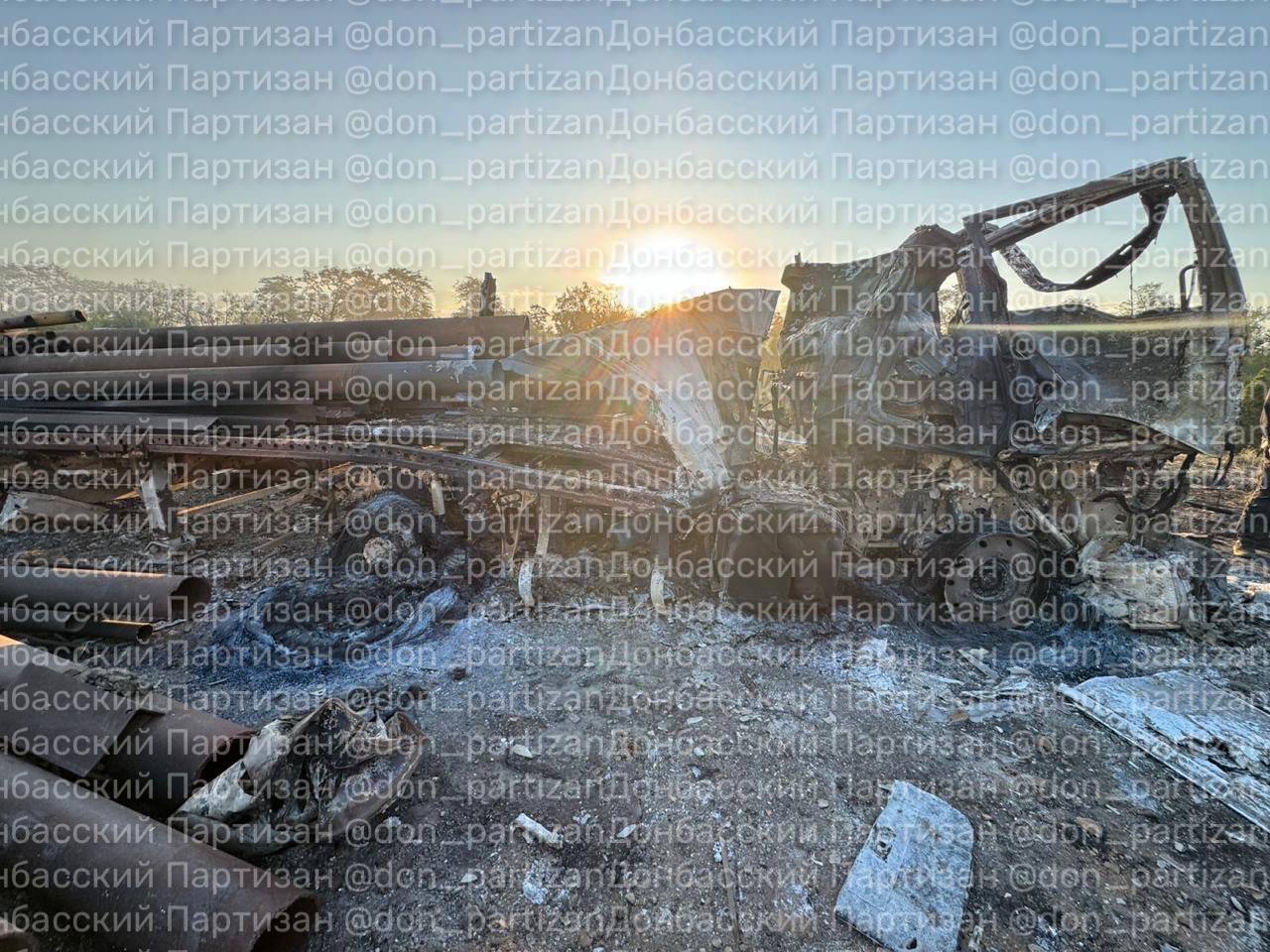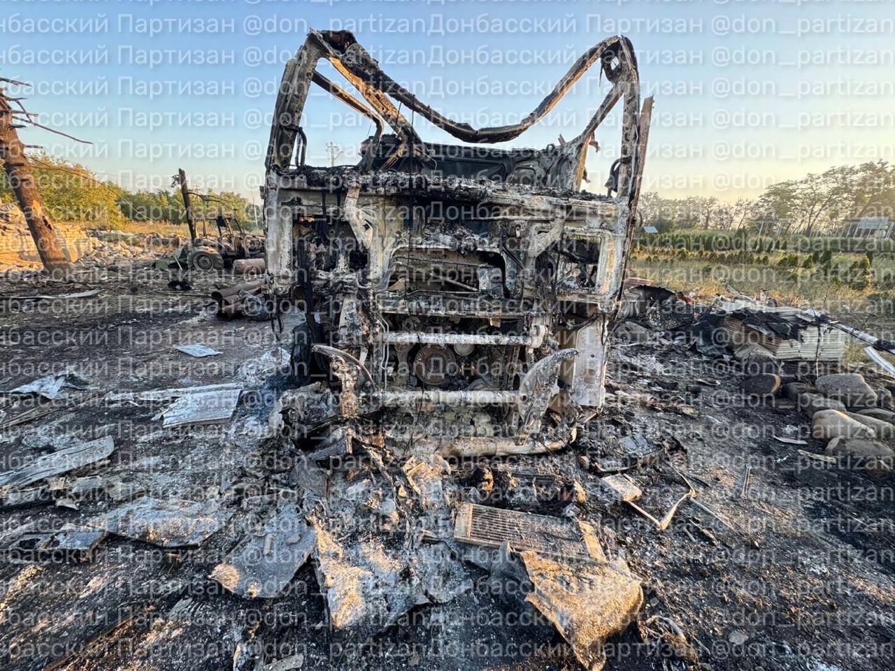 Полученные фотоснимки с места попадания однозначно подтверждают уничтожение временной базы размещения техники и личного состава. На кадрах зафиксированы полностью сгоревшие шасси колёсной техники, разрушенные ангары и обломки крупногабаритных грузовиков, характерных для армейского автопарка. Также видны следы вторичных детонаций, вызванных вероятным наличием боекомплекта, пишет Телеграм-канал «Донбасский партизан».
