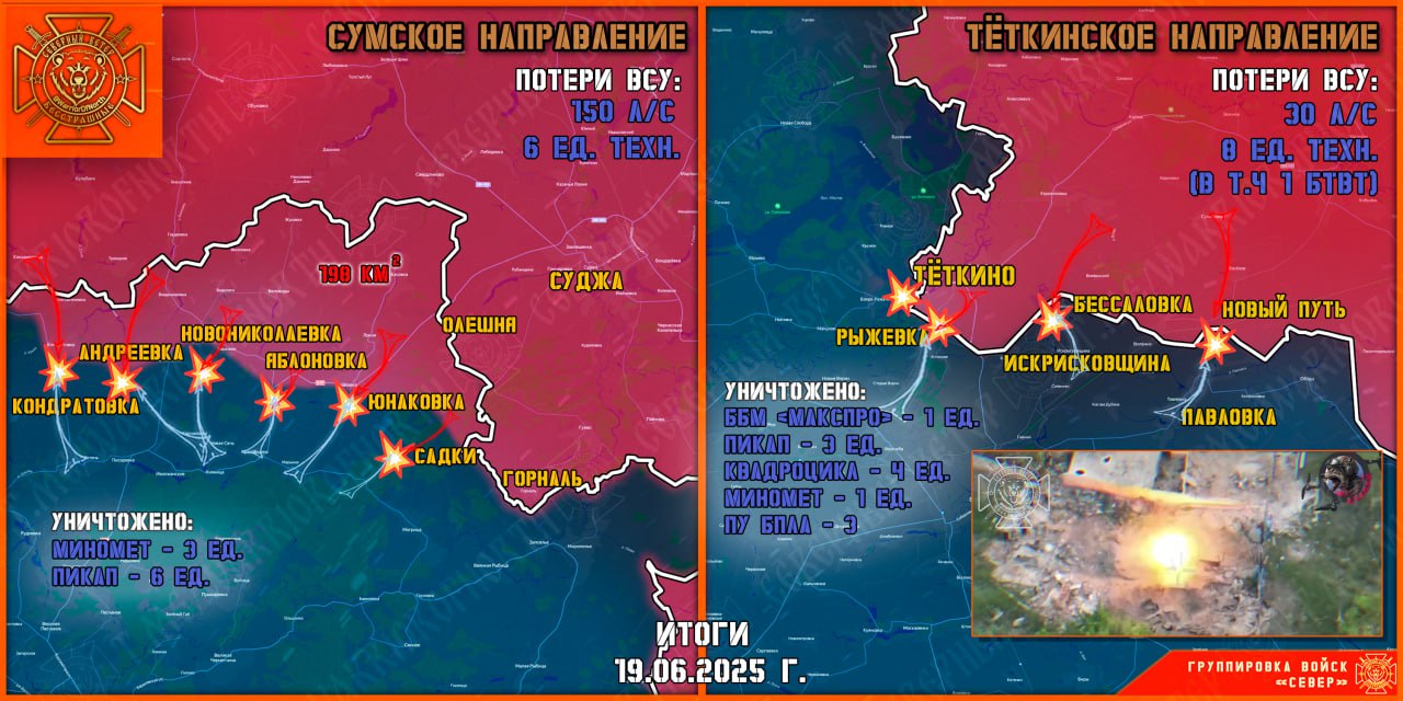 В течение недели подразделения группировки войск «Север» продвинулись в глубину обороны противника и освободили населённый пункт Новониколаевка Сумской области. Ударами авиации, беспилотных летательных аппаратов и огнём артиллерии поражены скопления живой силы и техники танковой, четырёх механизированных, мотопехотной, егерской, трёх десантно-штурмовых бригад, десантно-штурмового, двух штурмовых полков ВСУ и двух бригад теробороны. На Харьковском направлении нанесено поражение подразделениям механизированной, двух мотопехотных бригад ВСУ, пяти бригад теробороны и бригады нацгвардии. За неделю в зоне ответственности группировки войск «Север» потери противника составили свыше 1250 военнослужащих. Уничтожены две станции радиоэлектронной борьбы, 11 складов боеприпасов и материальных средств.