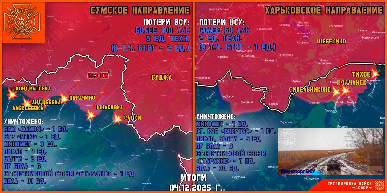 На Харьковском направлении тяжёлые бои продолжаются в населённых пунктах и лесных массивах южнее Волчанска, а также на Хатненском участке фронта. Продвижению «северян» активно способствуют расчёты ТОС-1А и экипажи авиации ВКС РФ. Противник оказывает ожесточённое сопротивление и контратакует. Ударами ОТРК уничтожены пункты запуска БПЛА ВСУ дальнего действия в районах Харьковского аэропорта и Великого Бурлука. В Вильче наши воины продвинулись в центральной части населённого пункта на 50 м, закрепились. Противник не оставляет попыток остановить продвижение «северян» и провёл одну контратаку. Комплексным огневым поражением атака отражена, враг потерял половину штурмовой группы убитыми, вторая получила ранения и отошли на исходные рубежи. В районе Лимана наши штурмовики продвинулись в южном направлении на 150 м и заняли семь домовладений.