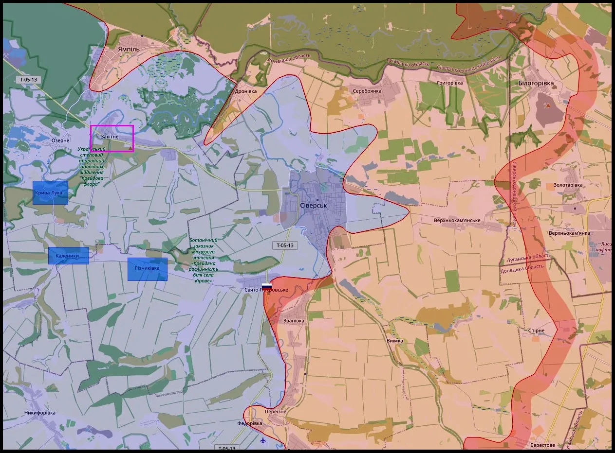 Сейчас Северский участок Краснолиманского направления, пожалуй, самый интересный и динамичный участок всей линии боевого соприкосновения в Славяно-Краматорской агломерации. Главный акцент российских войск – южный фланг Северска: активные удары и продавливание в районе Свято-Покровского, постоянная обработка Резниковки, постепенное выравнивание линии в сторону высот и меловых холмов. Закотное – ключевая точка. Прорыв здесь даёт сразу два стратегических плюса: обход Лимана с юга и выход во фланг и тыл всей западной и северо-западной оборонительной дуги Северска