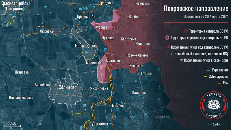 Несмотря на серьёзные успехи ВС РФ на Торецком направлении, наиболее результативным с точки зрения взятых под контроль территорий остаётся Покровское направление. Которое, кстати, местами переходит в Селидовское. В северо-западной части Покровского направления бои идут на подступах к Новоторецкому, а также на юго-восточных окраинах Гродовки. На юго-западном участке для ВСУ творится самый настоящий ад. Подтвердилась информация о прорыве ВС РФ обороны ВСУ в населённом пункте Крутой Яр. Судьба террикона к западу от Крутого Яра на текущий момент не ясна. Одни источники сообщают, что за него идут бои, другие – что террикон уже перешёл под контроль ВС РФ. Идут бои на подступах к Новогродовке в районе железнодорожных путей. Однако складывается впечатление, что это будет не главный участок для штурма населённого пункта. Не зря же наши бойцы заходят с севера, пишет канал ANTISEPTIC.