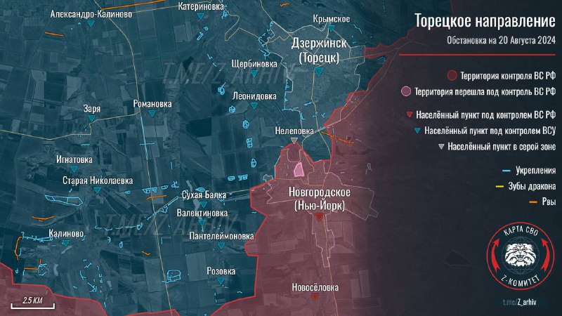 На ТОРЕЦКОМ (ДЗЕРЖИНСКОМ) направлении на западной окраине Зализного (Железного) ВС России заняли террикон шахты «Артёма», есть продвижение у Нью-Йорка (Новгородского), после освобождения которого наши войска пробиваются в сторону Нелеповки, отмечает канал «Два майора».