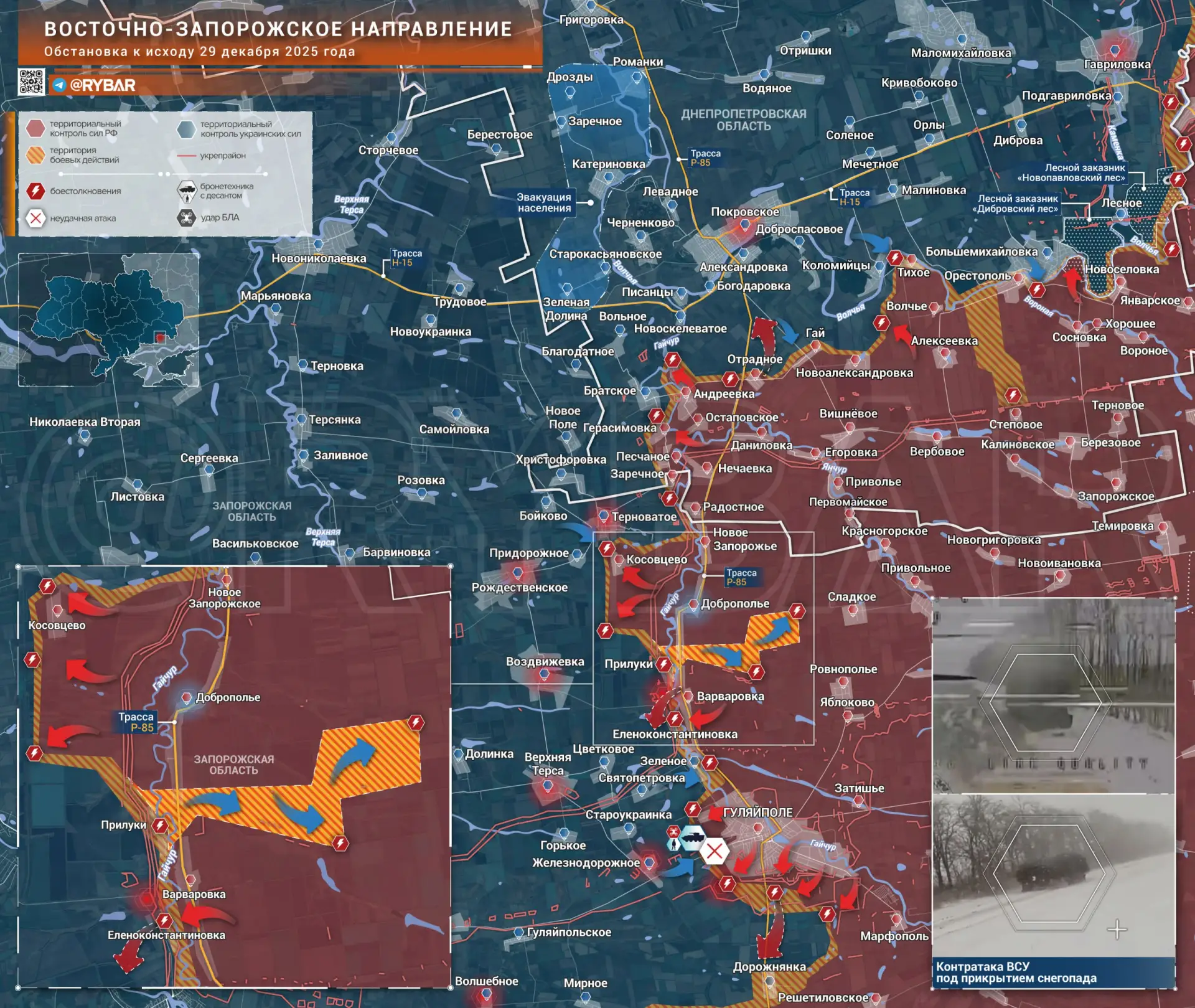 Растёт активность украинских формирований на Восточно-Запорожском направлении, где ВСУ недавно окончательно утратили Гуляйполе. Противник «опомнился» и теперь пытается не допустить закрепления ВС РФ на новых рубежах. Под прикрытием непогоды бронегруппа противника переправилась через Гайчур в районе села Прилуки. Затем ВСУ попытались прорваться в сторону Равнополья и Сладкого, разделившись, спустя несколько километров после пересечения русла реки. Но вражескую пехоту и технику сожгли операторы БЛА.