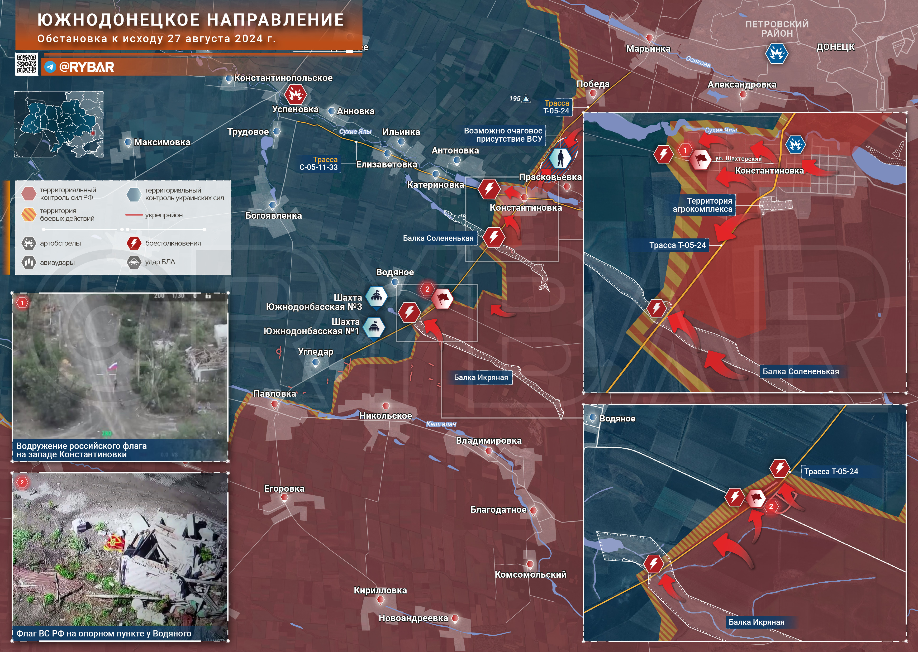 Относительно свободная прогулка российских бойцов в Константиновке демонстрирует отсутствие украинских формирований как к северу, так и югу от населённого пункта. В частности, противник явно отступил с участка трассы Т-05-24 от Константиновки до балки Солёненькая.