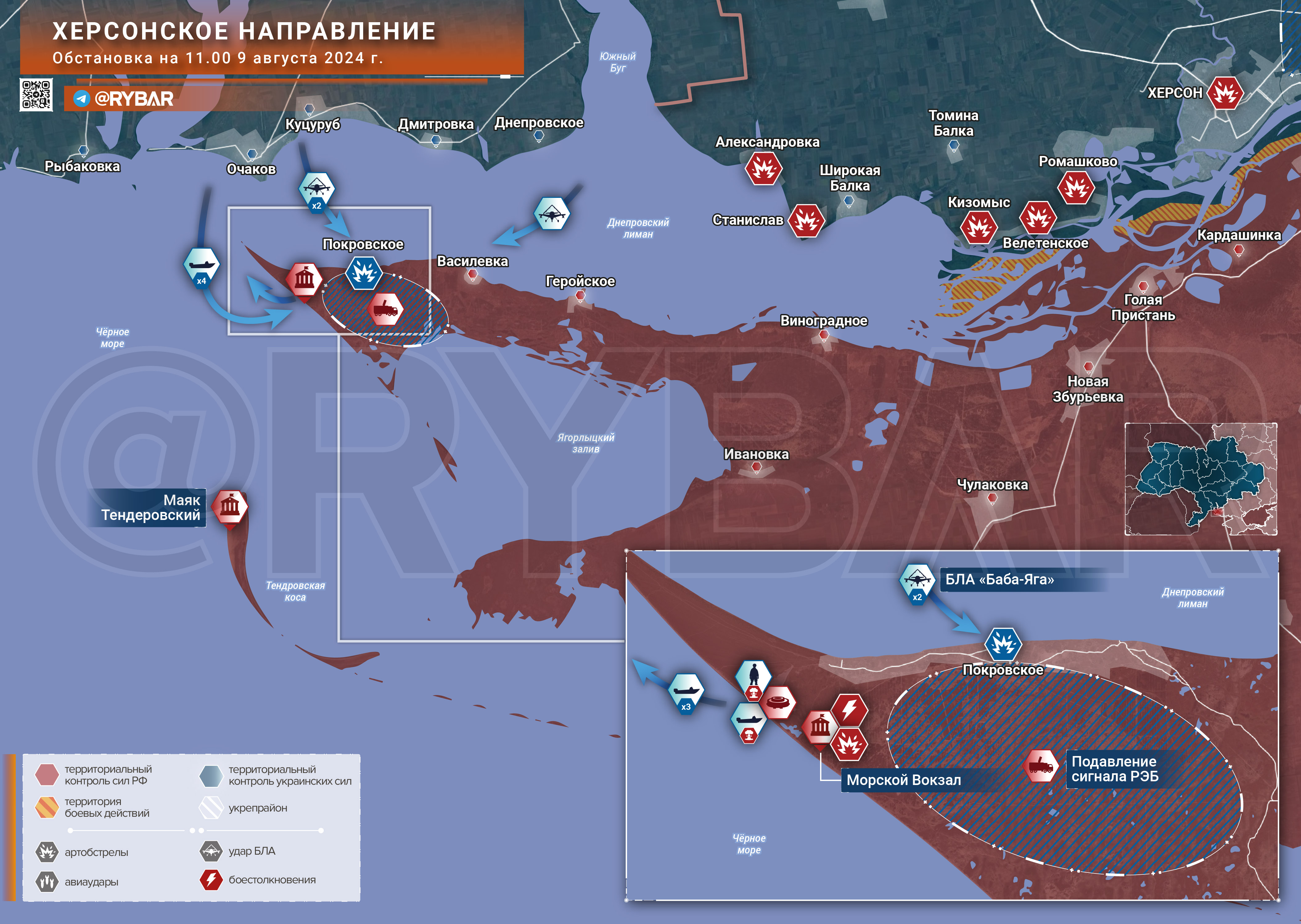 «Противник около четырёх часов утра предпринял масштабную попытку форсирования водной преграды в направлении Кинбурнской косы. Наша разведка отследила действия противника ещё на правом берегу Днепра. Попытка высадки десанта была пресечена. Противник понёс значительные потери», – сообщают с места событий.