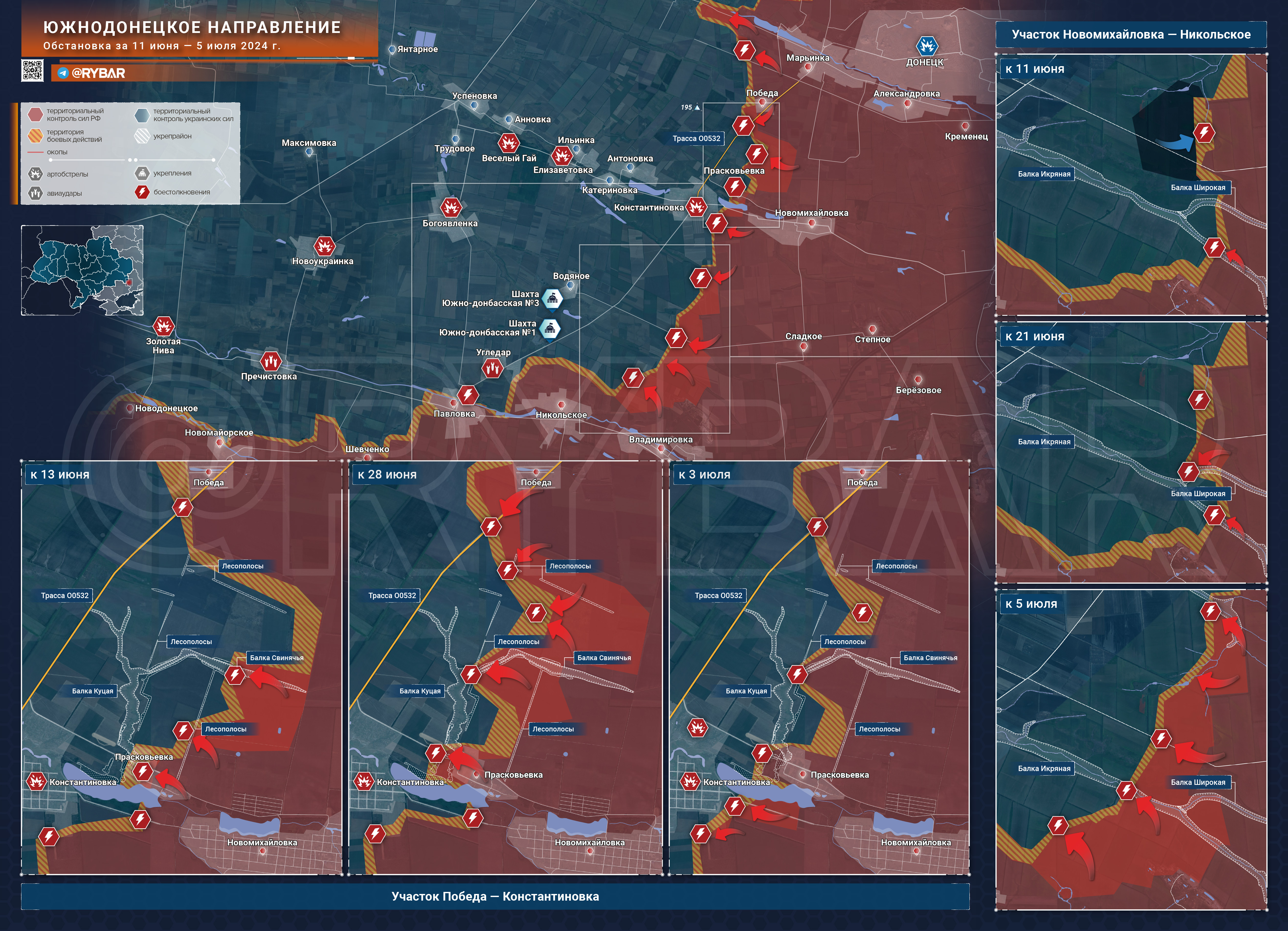 В Прасковиевке и к северу у балки Свинячья изменений зон контроля с обеих сторон пока не наблюдается. На юго-восточных окраинах Константиновки также идут бои: штурмовые группы ВС России уже заходили на территорию населённого пункта, однако подтвердить их закрепление там затруднительно ввиду отсутствия кадров объективного контроля.