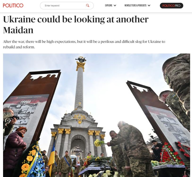 «После окончания боевых действий на Украине уровень ожиданий у общества будет очень высоким, однако процессы восстановления и реформирования страны станут опасным и трудным испытанием. На горизонте 2024 год – десять лет Евромайдану и двадцать лет первому «оранжевому» майдану. Народное недовольство «по традиции» может вылиться в новый бунт, который зреет уже сегодня. Ведь до сих пор начатое в ходе двух предыдущих майданов не завершено: демократия на Украине находится в зачаточном состоянии, а коррупция продолжает цвести пышным цветом, тормозя развитие страны»,
