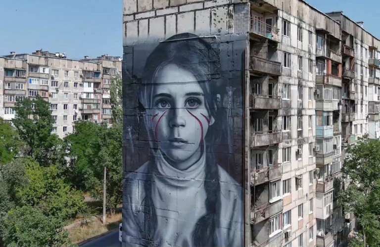 В Мариуполе на стене обычной девятиэтажки, немного побитой осколками снарядов и со следами пожара, появился новый чёрно-белый мурал – портрет девочки с красными полосами на лице. А вокруг девочки летят бомбы НАТО.