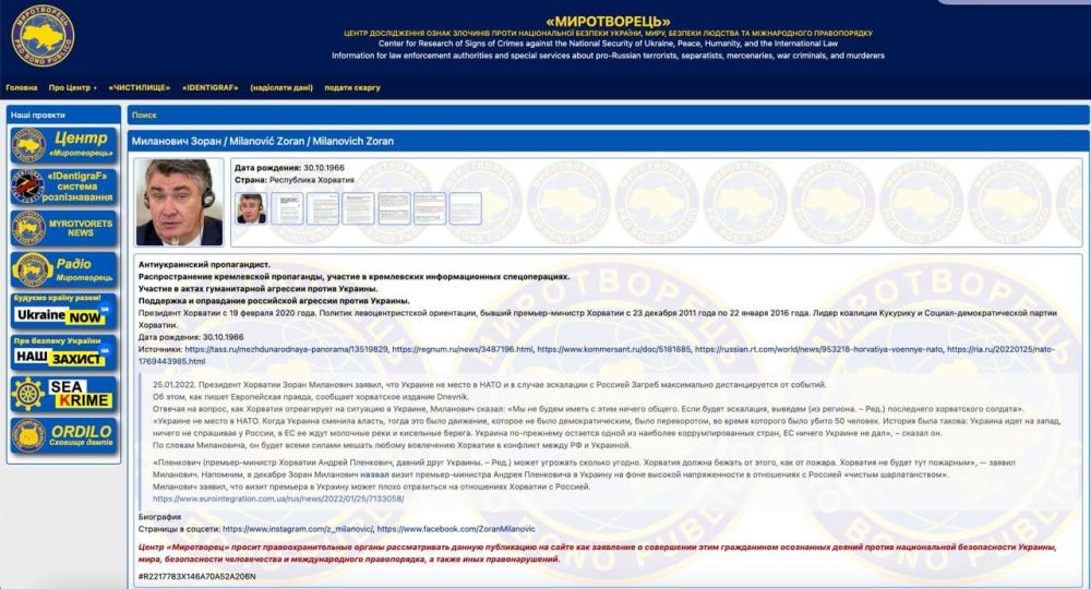 На Украине предсказуемо обиделись. А обидевшись, тут же отправили Зорана Милановича… на «Миротворец». Теперь на этом сайте президент Хорватии числится как антиукраинский пропагандист. А занесён он в базу «Миротворца» за «распространение кремлёвской пропаганды», за «участие в кремлёвских информационных спецоперациях» и за «участие в гуманитарной агрессии против Украины».