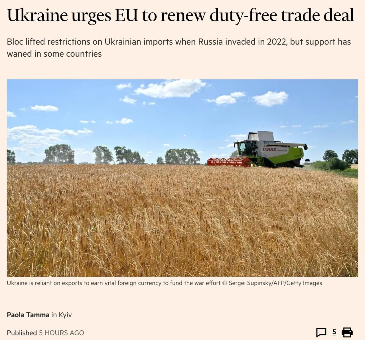 Украина зависит от экспорта, чтобы заработать для финансирования военных действий. Доходы от экспорта в ЕС составили почти 1/10 часть экспортной выручки страны в размере $41 млрд в 2024 году. Эти потоки могут оказаться под угрозой, если ЕС вовремя не продлит беспошлинную торговлю. Некоторые соседние страны не хотят расширять доступ на рынок для Украины опасаясь, что это навредит их фермерам и вызовет недовольство. Тем не менее, значительная часть экспорта, который Украина отправляет своим соседям, на самом деле идёт транзитом к другим покупателям», – цитирует заявление министра финансов Украины Сергея Марченко британская газета Financial Times.
