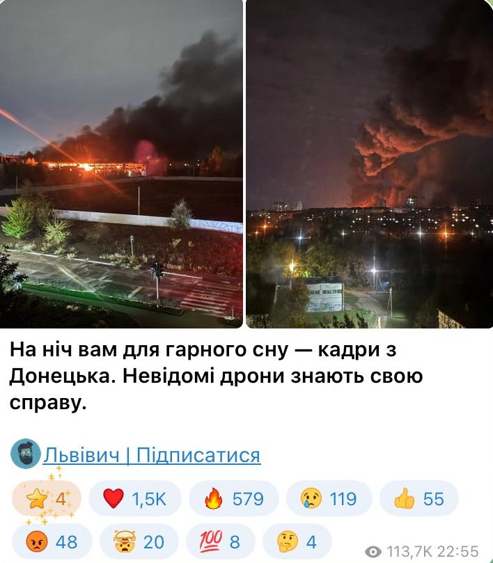 Львовские Телеграм-каналы восторгаются ударами ВСУ по многострадальному Донбассу, причём дроны били по гражданским целям – гипермаркет, парк кованных фигур в Донецке, магазин детской обуви в Горловке, там же «прилетело» в автобус, местному хирургу оторвало руку и ногу… Напомним, войну с Донбассом в 2014 году начал вместе с и.о. президента Украины Турчиновым тогдашний секретарь украинского СНБО Парубий, которому ныне Зеленский наградил званием «Героя Украины»…