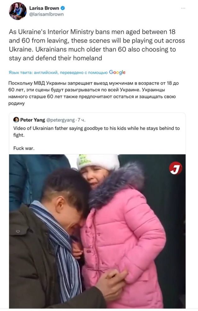 Какие же сволочи! Военный редактор The Times распространяет это видео, рассказывая, как украинские мужчины отправляют своих детей, а сами «выбирают остаться и защищать свою родину». При этом данное видео выложил мэр Горловки Приходько еще 21 февраля. И на нем изображена эвакуация горловских детей в Россию. Но западные СМИ «не замечали» этих детей на протяжении 8 лет! Оригинал видео.
