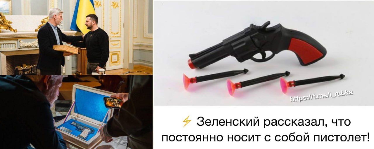 Намекая, что пришло время наступать, президент Чехии Петр Павел подарил Зеленскому чешскую ворованную копию браунинга, мол – вперед, в атаку! Хотя большинство комментаторов сошлись на том, что подарок – намёк на самоликвидацию, тем более, что несколькими днями ранее в репортаже из бункера Гнида сообщил, что уже давно ходит и спит с пистолетом, но замялся, когда у него спросили: это чтобы не сдаться врагам?