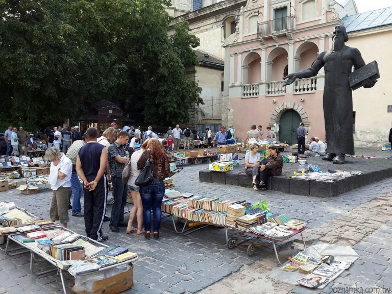 Заглавное фото: Львов. Городская букинистическая ярмарка на площади Музейной возле памятника первому русскому книгопечатнику Ивану Фёдорову