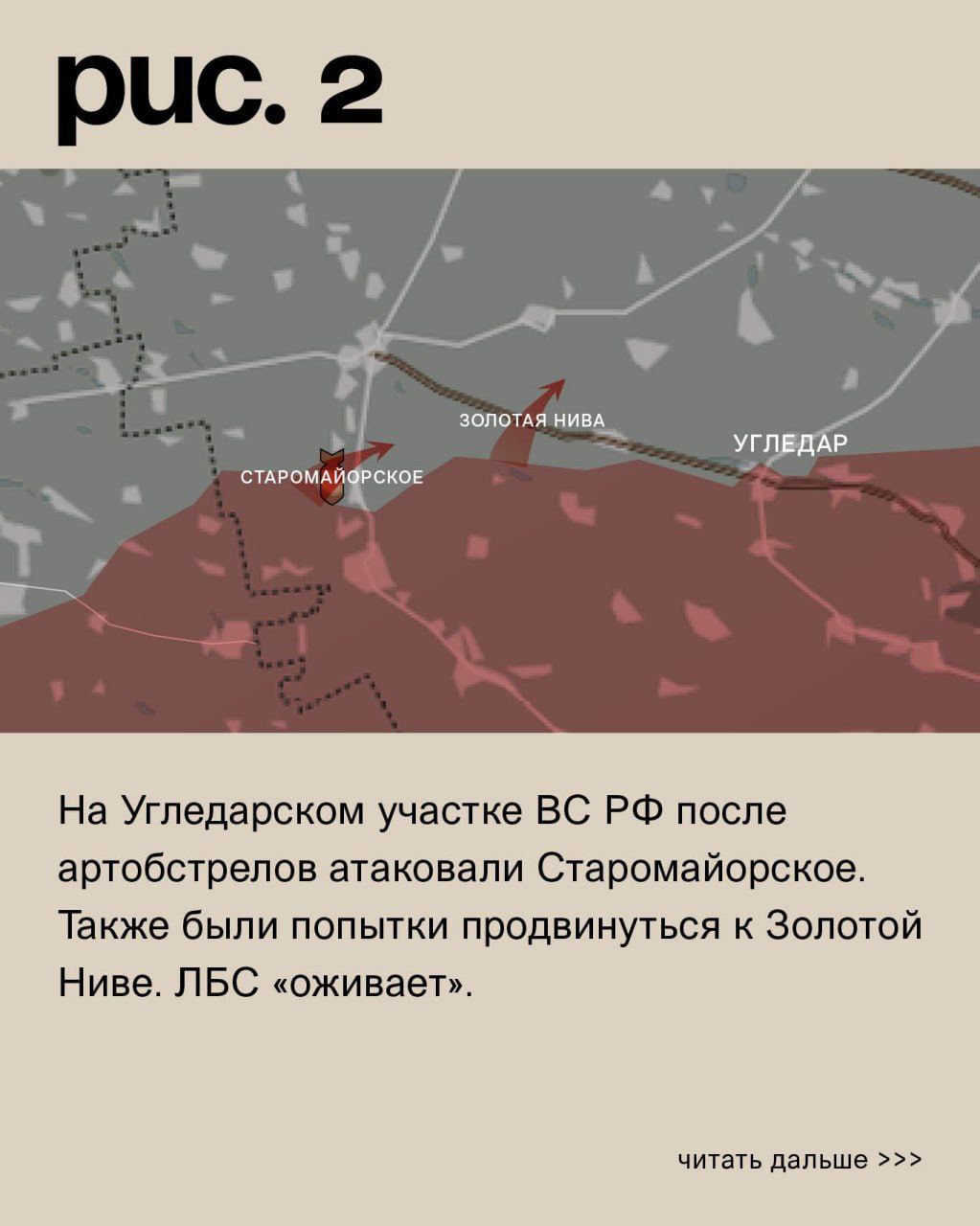 На УГЛЕДАРСКОМ участке ВС России после артобстрелов атаковали Старомайорское. Также были попытки продвинуться к Золотой Ниве. ЛБС «оживает». Российская артиллерия работала по ВСУ в Левадном, Зелёном Поле, Богоявленке и Водяном (не путать с одноимённым населённым пунктом к западу от Донецка). Украинская вела огонь по российским позициям в Приютном, Заветном Желании и Новомайорском.