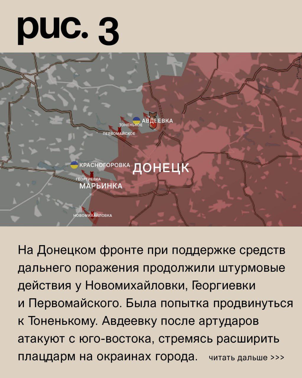 На ДОНЕЦКОМ фронте при поддержке средств дальнего поражения ВС РФ продолжили штурмовые действия у Новомихайловки, Георгиевки и Первомайского. Была попытка продвинуться к Тоненькому. Авдеевку после артударов атакуют с юго-востока, стремясь расширить плацдарм на окраинах города. Севернее ВС России наступают в районе Степного (не путать с одноимёнными населёнными пунктами на Запорожском и Угледарском направлениях). Под ударами ВСУ в Победе, Максимильяновке, Бердычах и Нью-Йорке. ВС РФ – в Донецке и селе Красногоровка.