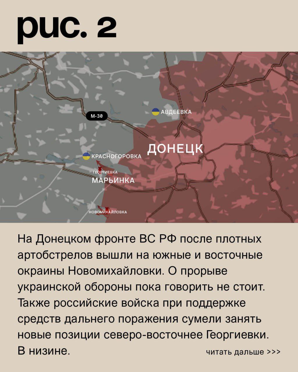 На ДОНЕЦКОМ фронте ВС России после плотных артобстрелов вышли на южные и восточные окраины Новомихайловки. О прорыве украинской обороны пока говорить не стоит. Также российские войска при поддержке средств дальнего поражения сумели занять новые позиции северо-восточнее Георгиевки. В низине. Впереди небольшие, но высоты. А дальше – серьёзные. На юго-восточных окраинах Авдеевки – те же встречные бои за контроль над флангами. Позиции ВСУ в городе под обстрелами российских войск. Северо-восточнее – продвижение ВС России в направлении Ласточкина. Также при поддержке артиллерии. Таким образом, под прямой огневой контроль попадает главный логистический маршрут снабжения украинского гарнизона в Авдеевке. Под ударами ВСУ в Екатериновке, Победе, городе Красногоровка, Первомайском, Нетайлове, Очеретине и Александрополе (населённый пункт к северу от Донецка). Российские – в Старомихайловке, Донецке и селе Красногоровка.